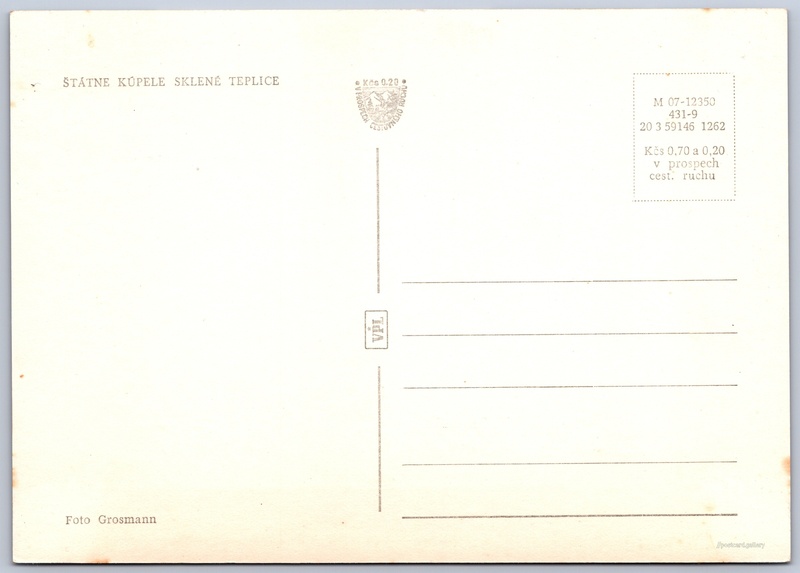 Sklené Teplice, lázně 2/2 Pokud chcete vidět pohlednice ve vyšším rozlišení nebo zobrazovat jejich zadní stranu, tak se prosím nejdříve přihlašte Přihlásit Zaregistrovat ŠTÁTNE KÚPELE SKLENÉ TEPLICE Jazyk tištěného textu na pohlednici: slovenština Sklené Teplice 104 ukázat na mapě V blízkém okolí místa zobrazeného na pohlednici lze najít 2 jiné pohlednice. Zobrazit blízké pohlednice Vydavatel: VPL (Československo) Rok vydání pohlednice: prosinec, 1962 Velikost (š x v) a tvar pohlednice: 146 x 103 mm (5.75" x 4.06"), obdélník Čistá pohlednice (neprošlá poštou) Ceny: Cena pohlednice: 0,70 Kčs (CSK) (+0,20 Kčs přípl. na tur. ruch) Kódy na pohlednici: M 07-12350 431-9 20 3 59146 1262 DiskuseVložit příspěvek Přidat novou složku ... Spravovat složky ...