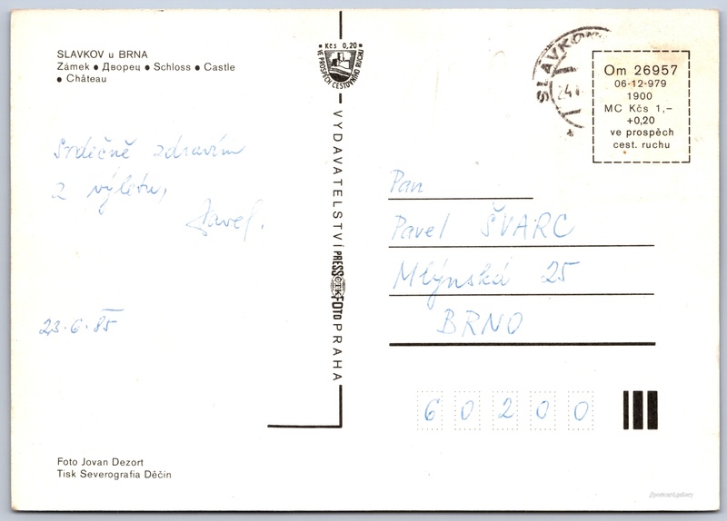 Slavkov u Brna, zámek Pokud chcete vidět pohlednice ve vyšším rozlišení nebo zobrazovat jejich zadní stranu, tak se prosím nejdříve přihlašte Přihlásit Zaregistrovat SLAVKOV u BRNA- Zámek- Двореч- Schloss- Castle- Château Jazyk tištěného textu na pohlednici: čeština Slavkov u Brna, Vyškov ukázat na mapě Vydavatel: PressFoto Praha (Československo) Rok vydání pohlednice: 1979 Velikost (š x v) a tvar pohlednice: 147 x 104 mm (5.79" x 4.09"), obdélník Osoby spjaté s touto pohlednicí: Jovan Dezort(Autor fotografie) Prošlá poštou:Datum na razítku: 23.6.1985Datum napsání pohledu: 23.6.1985 Ceny: Cena pohlednice: 1,00 Kčs (CSK) (+0,20 Kčs přípl. na tur. ruch) Kódy na pohlednici: Om 26957 06-12-979 1900 DiskuseVložit příspěvek Přidat novou složku ... Spravovat složky ...