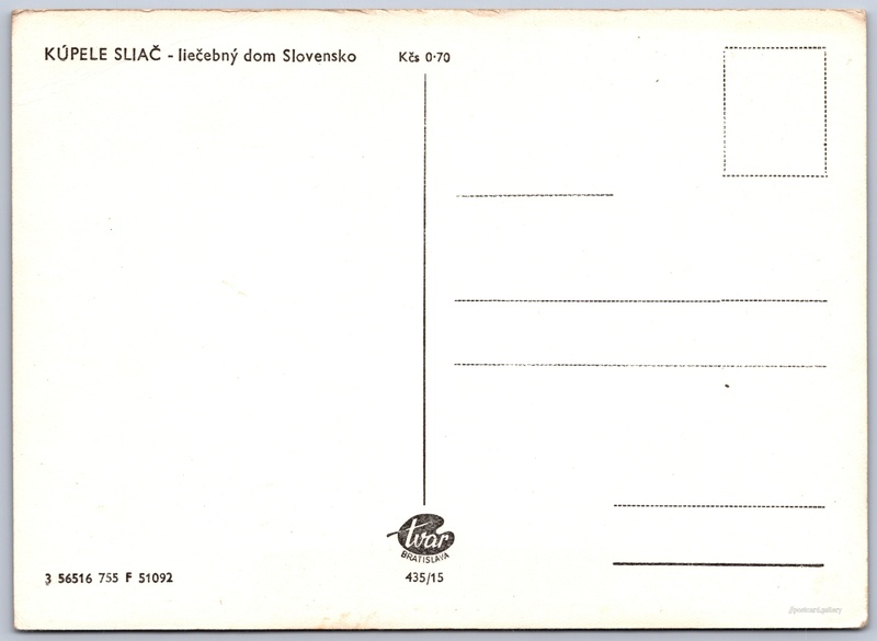 Sliač, léčebný dům Slovensko Pokud chcete vidět pohlednice ve vyšším rozlišení nebo zobrazovat jejich zadní stranu, tak se prosím nejdříve přihlašte Přihlásit Zaregistrovat KÚPELE SLIAČ - liečebný dom Slovensko Jazyk tištěného textu na pohlednici: slovenština Rybáre 717/4 ukázat na mapě V blízkém okolí místa zobrazeného na pohlednici lze najít 16 jiných pohlednic. Zobrazit blízké pohlednice Vydavatel: Tvar Bratislava (Československo) Rok vydání pohlednice: červenec, 1955 Velikost (š x v) a tvar pohlednice: 145 x 105 mm (5.71" x 4.13"), obdélník Čistá pohlednice (neprošlá poštou) Ceny: Cena pohlednice: 0,70 Kčs (CSK) Kódy na pohlednici: F 51092 435/15 3 56516 755 DiskuseVložit příspěvek Přidat novou složku ... Spravovat složky ...