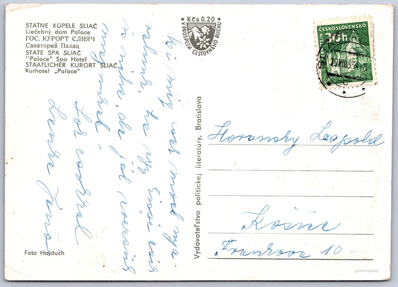 Sliač, liečebny dom Palace Pokud chcete vidět pohlednice ve vyšším rozlišení nebo zobrazovat jejich zadní stranu, tak se prosím nejdříve přihlašte Přihlásit Zaregistrovat ŠTÁTNE KÚPELE SLIAČLiečebný dom PalaceГОС. КУРОРТ СЛИЯЧСанаторий ПалацSTATE SPA SLIAČ"Palace" Spa HotelSTAATLICHER KURORT SLIAČKurhotel "Palace“ Jazyk tištěného textu na pohlednici: slovenština Liečebný dom Palace, Rybáre 781/3, Sliač - Rybáre, Slovensko ukázat na mapě V blízkém okolí místa zobrazeného na pohlednici lze najít 12 jiných pohlednic. Zobrazit blízké pohlednice Vydavatel: VPL (Československo) Odhadované datum vydání pohlednice: 1960 - 1963 Pomozte nám zpřesnit rok vzniku pohlednice Velikost (š x v) a tvar pohlednice: 147 x 104 mm (5.79" x 4.09"), obdélník Osoby spjaté s touto pohlednicí: Hajduch(Autor fotografie) Prošlá poštou:Datum na razítku: 19.8.1963 Ceny: Příplatek na tur. ruch: 0,20 Kčs (CSK))Vyplacené známky: 0,30 Kčs (CSK) DiskuseVložit příspěvek Přidat novou složku ... Spravovat složky ...