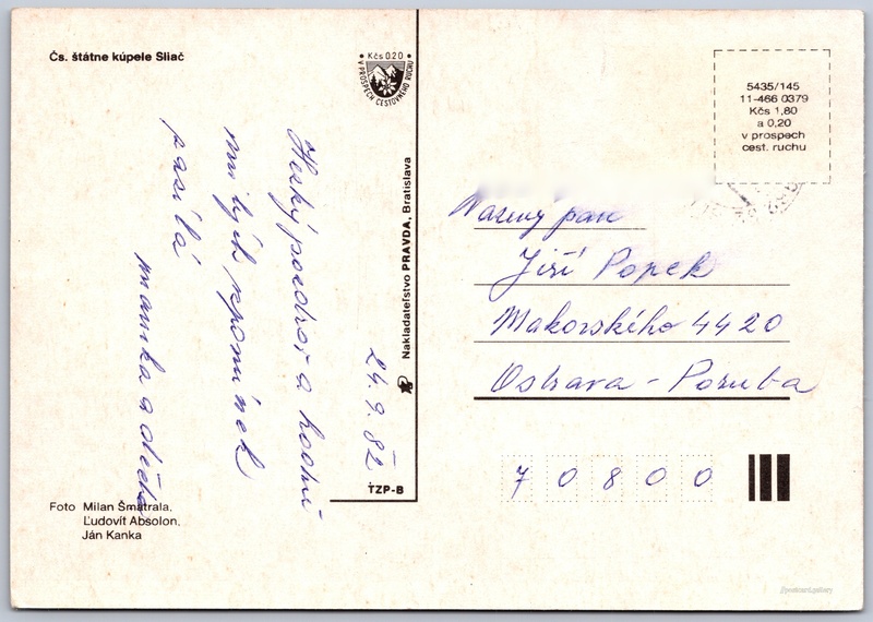 Cena pohlednice: 1,80 Kčs (CSK) (+0,20 Kčs přípl. na tur. ruch)