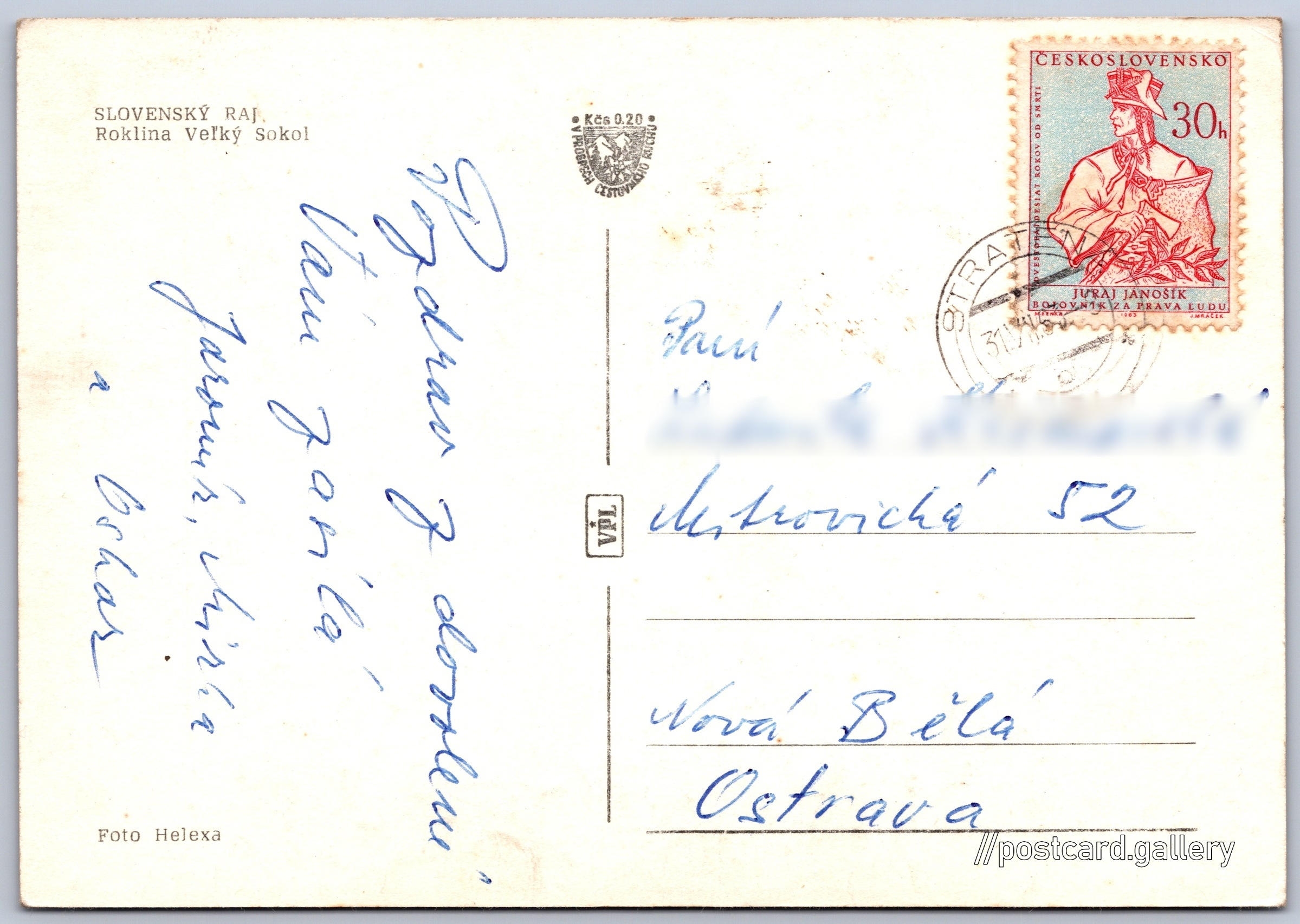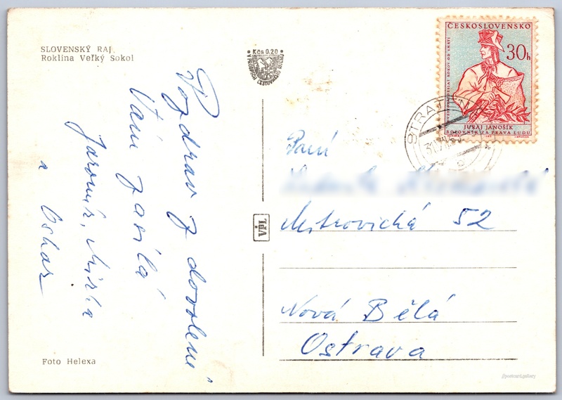 Slovenský ráj, roklina Velký sokol Pokud chcete vidět pohlednice ve vyšším rozlišení nebo zobrazovat jejich zadní stranu, tak se prosím nejdříve přihlašte Přihlásit Zaregistrovat SLOVENSKÝ RAJ.Roklina Veľký Sokol Jazyk tištěného textu na pohlednici: slovenština W992+WW Stratená, Slovakia ukázat na mapě V blízkém okolí místa zobrazeného na pohlednici lze najít 5 jiných pohlednic. Zobrazit blízké pohlednice Vydavatel: VPL (Československo) Odhadované datum vydání pohlednice: 1960 - 1963 Pomozte nám zpřesnit rok vzniku pohlednice Velikost (š x v) a tvar pohlednice: 146 x 101 mm (5.75" x 3.98"), obdélník Osoby spjaté s touto pohlednicí: Rudolf Helexa(Autor fotografie) Prošlá poštou:Datum na razítku: 31.7.1963 Ceny: Příplatek na tur. ruch: 0,20 Kčs (CSK))Vyplacené známky: 0,30 Kčs (CSK) DiskuseVložit příspěvek Přidat novou složku ... Spravovat složky ...
