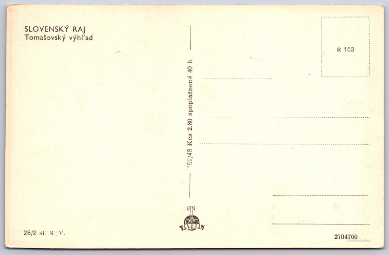 Slovenský ráj, Tomašovské výhledy Pokud chcete vidět pohlednice ve vyšším rozlišení nebo zobrazovat jejich zadní stranu, tak se prosím nejdříve přihlašte Přihlásit Zaregistrovat SLOVENSKÝ RAJTomašovský výhľ'ad Jazyk tištěného textu na pohlednici: slovenština Tomášovský výhľad, Výhled, Spišské Tomášovce, Slovensko ukázat na mapě V blízkém okolí místa zobrazeného na pohlednici lze najít 7 jiných pohlednic. Zobrazit blízké pohlednice Vydavatel: Tatran (Československo) Datum vydání není známo Pomozte nám odhadnout datum vzniku pohlednice Velikost (š x v) a tvar pohlednice: 139 x 90 mm (5.47" x 3.54"), obdélník Čistá pohlednice (neprošlá poštou) Ceny: Cena pohlednice: 2,80 Kčs (CSK) (+0,40 Kčs přípl. na tur. ruch) Kódy na pohlednici: R 163 159/48 28/2 DiskuseVložit příspěvek Přidat novou složku ... Spravovat složky ...
