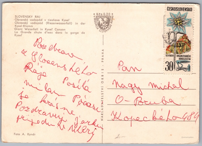 Slovenský ráj, Vodopád v tiesňave Kyseľ Pokud chcete vidět pohlednice ve vyšším rozlišení nebo zobrazovat jejich zadní stranu, tak se prosím nejdříve přihlašte Přihlásit Zaregistrovat SLOVENSKÝ RAJ- Obrovský vodopád v tiesňave Kyseľ- Obrovský vodopád (Riesenwasserfall) in der Kysel-Klamm- Giant Waterfall in Kyseľ Canyon- La Grande chute d'eau dans la gorge de Kyseľ Jazyk tištěného textu na pohlednici: slovenština Vodopád v barikáde, Vodopád, Letanovce, Slovensko ukázat na mapě V blízkém okolí místa zobrazeného na pohlednici lze najít 9 jiných pohlednic. Zobrazit blízké pohlednice Vydavatel: Nakladatelství Orbis (Československo) Datum vydání není známo Pomozte nám odhadnout datum vzniku pohlednice Velikost (š x v) a tvar pohlednice: 150 x 106 mm (5.91" x 4.17"), obdélník Osoby spjaté s touto pohlednicí: Antonín Kyndr(Autor fotografie) Prošlá poštou Ceny: Příplatek na tur. ruch: 0,20 Kčs (CSK))Vyplacené známky: 0,30 Kčs (CSK) DiskuseVložit příspěvek Přidat novou složku ... Spravovat složky ...