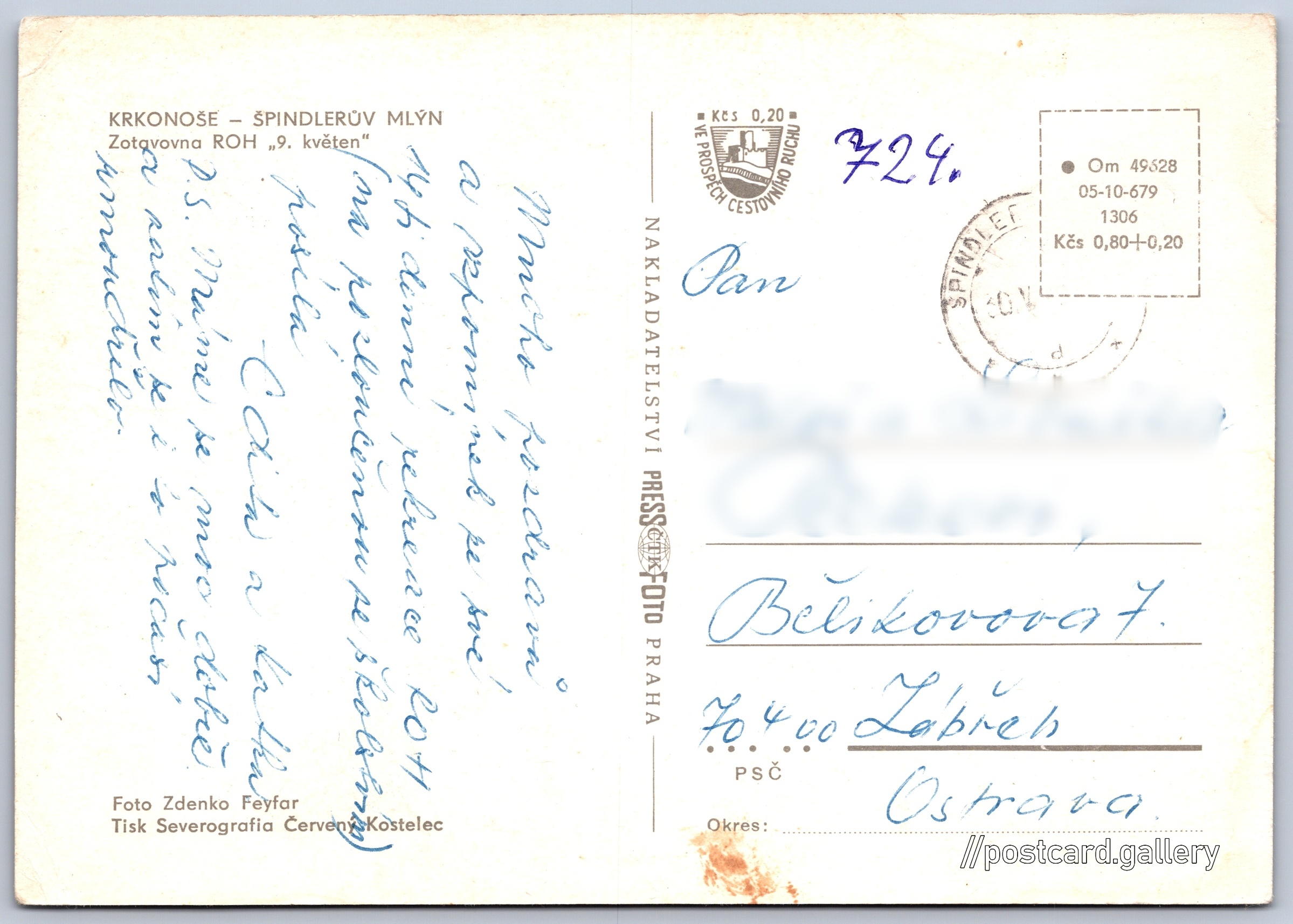 Špindlerům Mlýn, zotavovna ROH 9. květen Pokud chcete vidět pohlednice ve vyšším rozlišení nebo zobrazovat jejich zadní stranu, tak se prosím nejdříve přihlašte Přihlásit Zaregistrovat KRKONOŠE - ŠPINDLERŮV MLÝNZotavovna ROH "9. květen“ Jazyk tištěného textu na pohlednici: čeština Špindlerův Mlýn 164, Adresa, Špindlerův Mlýn, Česko ukázat na mapě V blízkém okolí místa zobrazeného na pohlednici lze najít 30 jiných pohlednic. Zobrazit blízké pohlednice Vydavatel: PressFoto Praha (Československo) Rok vydání pohlednice: 1976 Velikost (š x v) a tvar pohlednice: 148 x 104 mm (5.83" x 4.09"), obdélník Osoby spjaté s touto pohlednicí: Zdenko Feyfar(Autor fotografie) Prošlá poštou Ceny: Cena pohlednice: 0,80 Kčs (CSK) (+0,20 Kčs přípl. na tur. ruch) Kódy na pohlednici: •Om 49828 05-10-679 1306 DiskuseVložit příspěvek Přidat novou složku ... Spravovat složky ...