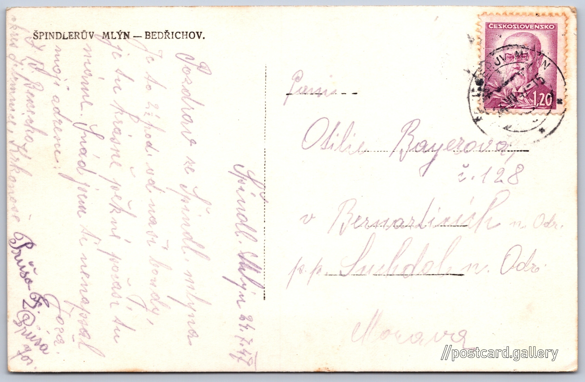 Špindlerův Mlýn, Bedřichov Pokud chcete vidět pohlednice ve vyšším rozlišení nebo zobrazovat jejich zadní stranu, tak se prosím nejdříve přihlašte Přihlásit Zaregistrovat ŠPINDLERŮV MLÝN - BEDŘICHOV. Jazyk tištěného textu na pohlednici: čeština Bedřichov, Špindlerův Mlýn, Trutnov ukázat na mapě V blízkém okolí místa zobrazeného na pohlednici lze najít 30 jiných pohlednic. Zobrazit blízké pohlednice Odhadované datum vydání pohlednice: 1945 - 1947 Pomozte nám zpřesnit rok vzniku pohlednice Velikost (š x v) a tvar pohlednice: 140 x 90 mm (5.51" x 3.54"), obdélník Prošlá poštou:Datum na razítku: 24.7.1947Datum napsání pohledu: 24.7.1947 Ceny: Vyplacené známky: 1,20 Kčs (CSK) DiskuseVložit příspěvek Přidat novou složku ... Spravovat složky ...