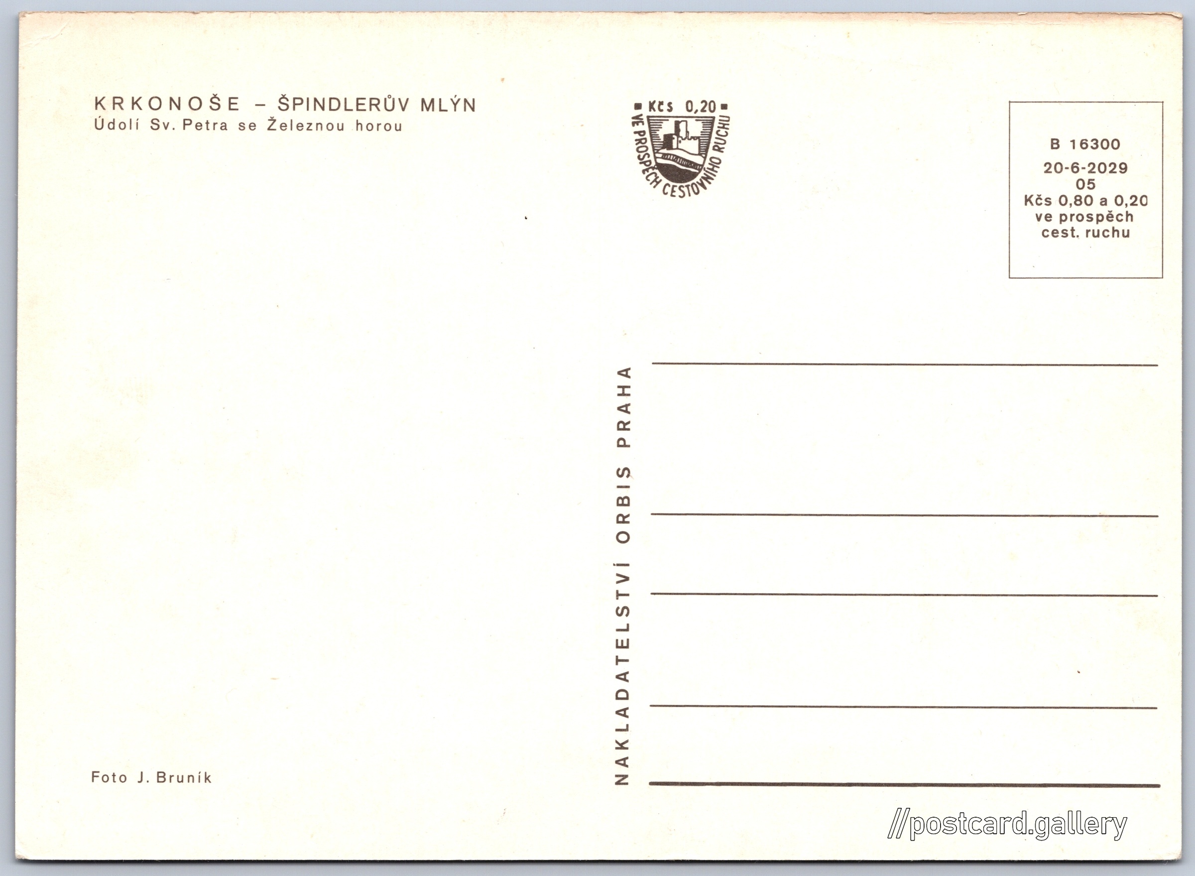 Špindlerův Mlýn, Údolí sv. Petra 4/45 Pokud chcete vidět pohlednice ve vyšším rozlišení nebo zobrazovat jejich zadní stranu, tak se prosím nejdříve přihlašte Přihlásit Zaregistrovat KRKONOŠE - ŠPINDLERŮV MLÝNÚdolí Sv. Petra se Železnou horou Jazyk tištěného textu na pohlednici: čeština Špindlerův Mlýn, Trutnov ukázat na mapě V blízkém okolí místa zobrazeného na pohlednici lze najít 46 jiných pohlednic. Zobrazit blízké pohlednice Vydavatel: Nakladatelství Orbis (Československo) Datum vydání není známo Pomozte nám odhadnout datum vzniku pohlednice Velikost (š x v) a tvar pohlednice: 146 x 106 mm (5.75" x 4.17"), obdélník Osoby spjaté s touto pohlednicí: Jiří Bruník(Autor fotografie) Čistá pohlednice (neprošlá poštou) Ceny: Cena pohlednice: 0,80 Kčs (CSK) (+0,20 Kčs přípl. na tur. ruch) Kódy na pohlednici: B 16300 20-6-2029 05 DiskuseVložit příspěvek Přidat novou složku ... Spravovat složky ...