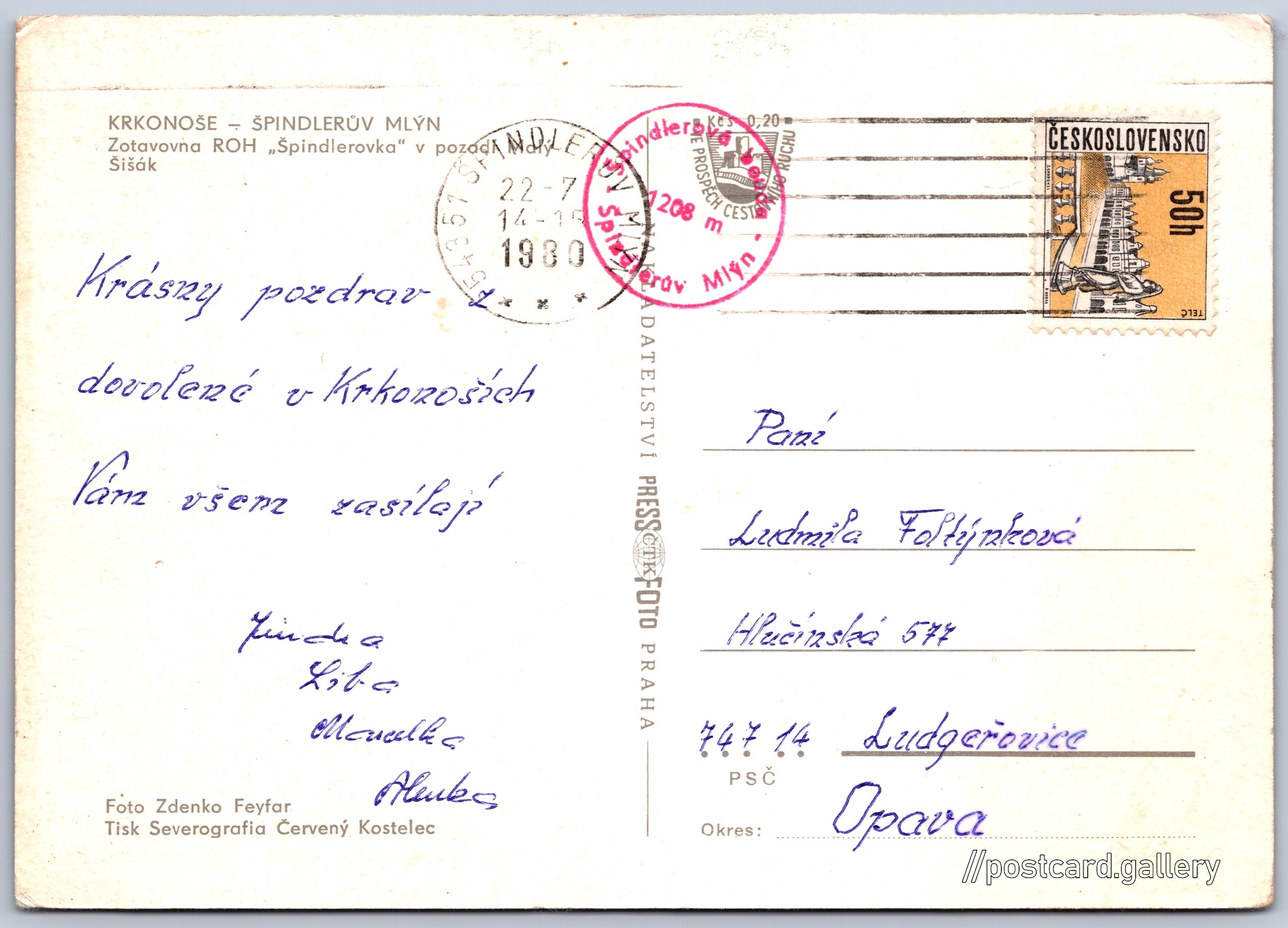 Špindlerův mlýn, zotavovna ROH Špindlerovka Pokud chcete vidět pohlednice ve vyšším rozlišení nebo zobrazovat jejich zadní stranu, tak se prosím nejdříve přihlašte Přihlásit Zaregistrovat KRKONOŠE ŠPINDLERŮV MLÝNZotavovňa ROH "Špindlerovka" v pozadí Šišák Jazyk tištěného textu na pohlednici: čeština Špindlerův Mlýn 108, Špindlerův Mlýn, 543 51, Trutnov ukázat na mapě V blízkém okolí místa zobrazeného na pohlednici lze najít 32 jiných pohlednic. Zobrazit blízké pohlednice Vydavatel: PressFoto Praha (Československo) Odhadované datum vydání pohlednice: 1977 - 1980 Pomozte nám zpřesnit rok vzniku pohlednice Velikost (š x v) a tvar pohlednice: 148 x 104 mm (5.83" x 4.09"), obdélník Osoby spjaté s touto pohlednicí: Zdenko Feyfar(Autor fotografie) Prošlá poštou:Datum na razítku: 22.7.1980 Ceny: Příplatek na tur. ruch: 0,20 Kčs (CSK))Vyplacené známky: 0,30 Kčs (CSK) DiskuseVložit příspěvek Přidat novou složku ... Spravovat složky ...
