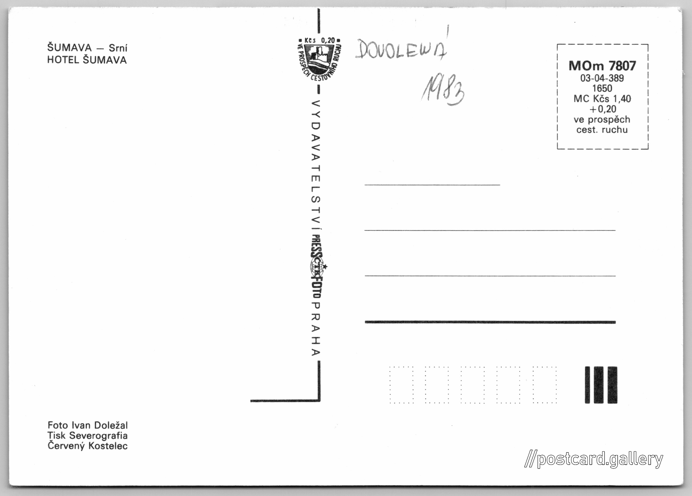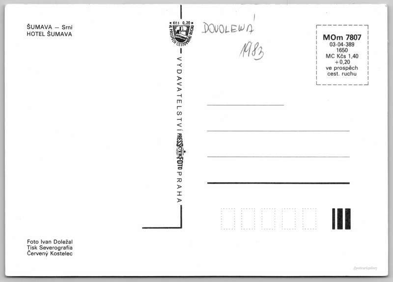 Srní, hotel Šumava 2/3 Pokud chcete vidět pohlednice ve vyšším rozlišení nebo zobrazovat jejich zadní stranu, tak se prosím nejdříve přihlašte Přihlásit Zaregistrovat Srní - hotel Šumava ŠUMAVA - SrníHOTEL ŠUMAVA Jazyk tištěného textu na pohlednici: čeština Srní, Klatovy ukázat na mapě Vydavatel: PressFoto Praha (Československo) Rok vydání pohlednice: 1983 Velikost (š x v) a tvar pohlednice: 148 x 105 mm (5.83" x 4.13"), obdélník Osoby spjaté s touto pohlednicí: Ivan Doležal(Autor fotografie) Čistá pohlednice (neprošlá poštou) Ceny: Cena pohlednice: 1,40 Kčs (CSK) (+0,20 Kčs přípl. na tur. ruch) Kódy na pohlednici: MOm 7807 03-04-389 1650 DiskuseVložit příspěvek Přidat novou složku ... Spravovat složky ...