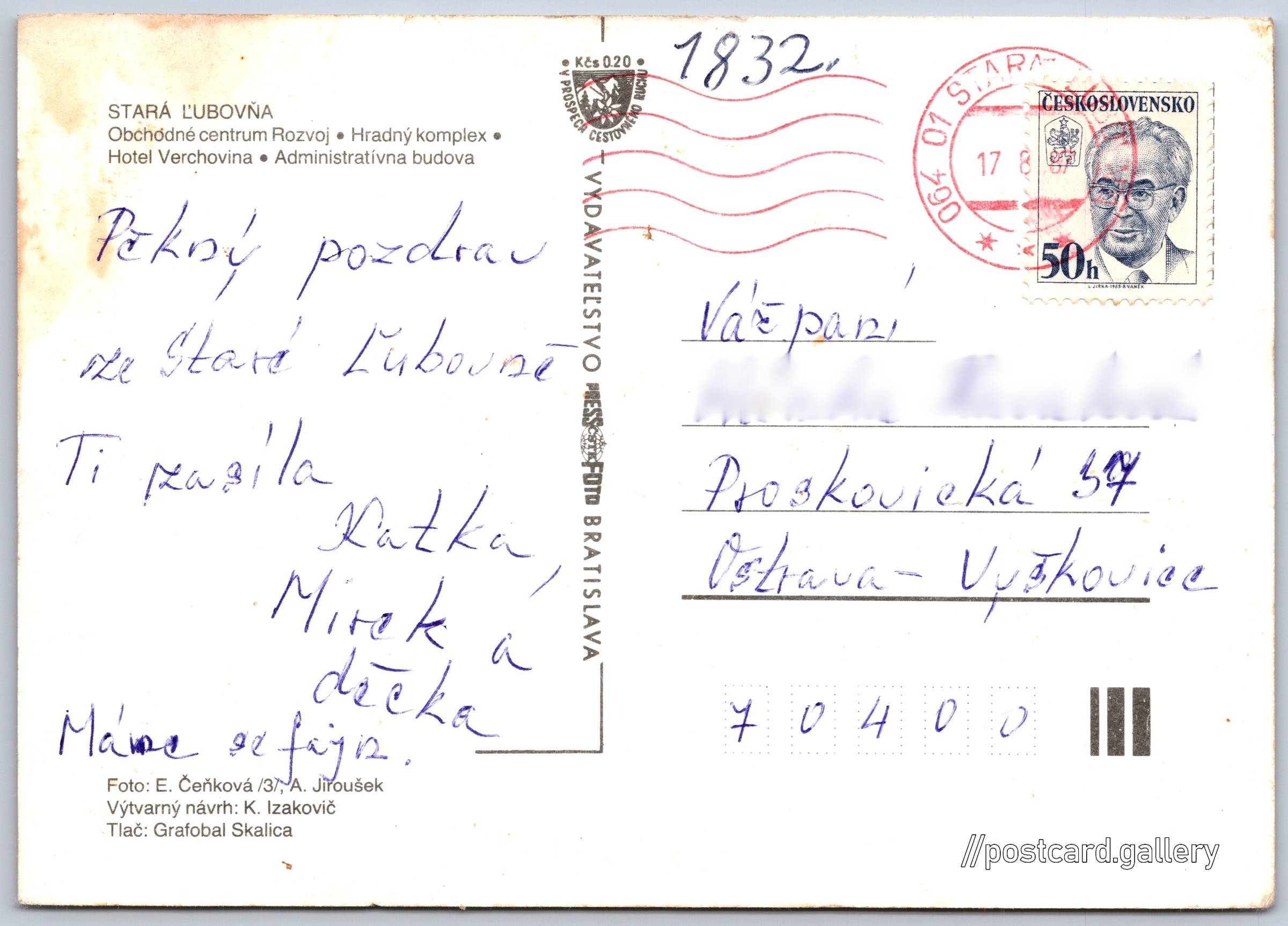 Stará Lubovňa Pokud chcete vidět pohlednice ve vyšším rozlišení nebo zobrazovat jejich zadní stranu, tak se prosím nejdříve přihlašte Přihlásit Zaregistrovat Stará Ľubovňa STARÁ ĽUBOVŇA- Obchodné centrum Rozvoj- Hradný komplex- Hotel Verchovina- Administratívna budova Jazyk tištěného textu na pohlednici: slovenština Ľubovnianský hrad, Hrad, Stará Ľubovňa, Slovensko ukázat na mapě Vydavatel: PressFoto Bratislava (Československo) Odhadované datum vydání pohlednice: 1984 - 1987 Pomozte nám zpřesnit rok vzniku pohlednice Velikost (š x v) a tvar pohlednice: 147 x 105 mm (5.79" x 4.13"), obdélník Osoby spjaté s touto pohlednicí: Emilia Čeňková(Autor fotografie) K. Izakovič(Design pohlednice) Alexander Jiroušek(Autor fotografie) Prošlá poštou:Datum na razítku: 17.8.1987 Ceny: Příplatek na tur. ruch: 0,20 Kčs (CSK))Vyplacené známky: 0,50 Kčs (CSK) DiskuseVložit příspěvek Přidat novou složku ... Spravovat složky ...