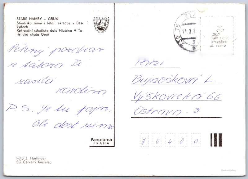 Staré Hamry, Gruň 9/28 Pokud chcete vidět pohlednice ve vyšším rozlišení nebo zobrazovat jejich zadní stranu, tak se prosím nejdříve přihlašte Přihlásit Zaregistrovat Staré HamryGruň STARÉ HAMRY - GRUŇStředisko zimní i letní rekreace v Beskydech- Rekreační středisko dolu Hlubina- Turistická chata Gruň Jazyk tištěného textu na pohlednici: čeština Staré Hamry, Frýdek-Místek ukázat na mapě Vydavatel: Panorama (Československo) Datum vydání není známo Pomozte nám odhadnout datum vzniku pohlednice Velikost (š x v) a tvar pohlednice: 147 x 105 mm (5.79" x 4.13"), obdélník Osoby spjaté s touto pohlednicí: Zd. Hartinger(Autor fotografie) Prošlá poštou Ceny: Cena pohlednice: 1,40 Kčs (CSK) (+0,20 Kčs přípl. na tur. ruch) DiskuseVložit příspěvek Přidat novou složku ... Spravovat složky ...
