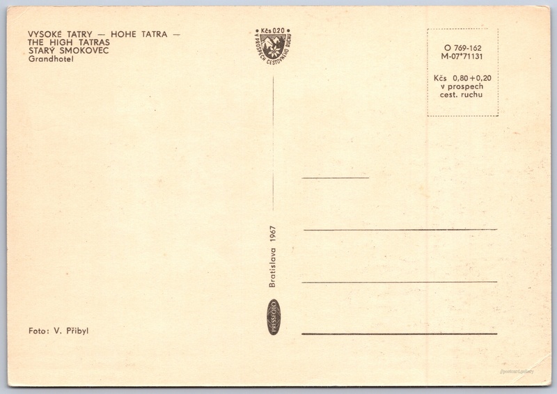 Starý Smokovec, Grandhotel Pokud chcete vidět pohlednice ve vyšším rozlišení nebo zobrazovat jejich zadní stranu, tak se prosím nejdříve přihlašte Přihlásit Zaregistrovat VYSOKÉ TATRY - HOHE TATRA - THE HIGH TATRASSTARÝ SMOKOVECGrandhotel Jazyky tištěného textu na pohlednici: slovenština, němčina, angličtina Starý Smokovec ukázat na mapě Vydavatel: PressFoto Bratislava (Československo) Rok vydání pohlednice: 1967 Velikost (š x v) a tvar pohlednice: 150 x 105 mm (5.91" x 4.13"), obdélník Osoby spjaté s touto pohlednicí: V. Přibyl(Autor fotografie) Čistá pohlednice (neprošlá poštou) Ceny: Cena pohlednice: 0,80 Kčs (CSK) (+0,20 Kčs přípl. na tur. ruch) Kódy na pohlednici: O 769-162 M-07*71131 DiskuseVložit příspěvek Přidat novou složku ... Spravovat složky ...