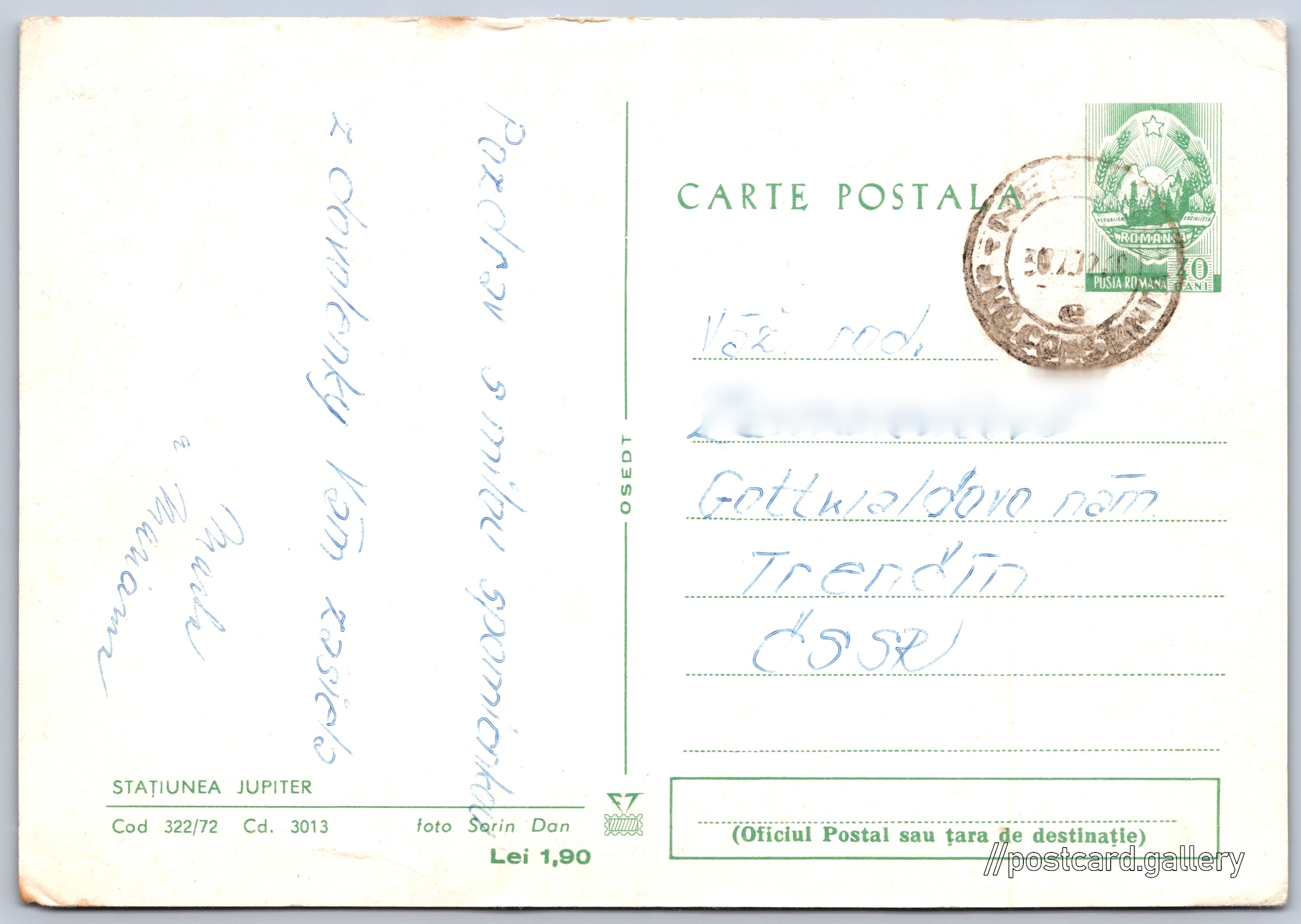 Statiunea Jupiter Pokud chcete vidět pohlednice ve vyšším rozlišení nebo zobrazovat jejich zadní stranu, tak se prosím nejdříve přihlašte Přihlásit Zaregistrovat STAȚIUNEA JUPITER Jazyk tištěného textu na pohlednici: rumunština Jupiter ukázat na mapě Vydavatel: OSEDT (Rumunsko) Odhadované datum vydání pohlednice: 1969 - 1972 Pomozte nám zpřesnit rok vzniku pohlednice Velikost (š x v) a tvar pohlednice: 148 x 104 mm (5.83" x 4.09"), obdélník Osoby spjaté s touto pohlednicí: Dan Sorin(Autor fotografie) Prošlá poštou:Datum na razítku: 30.7.1972 Ceny: Cena pohlednice: 1,90 lei (RON)Vyplacené známky: 0,40 lei (RON) Kódy na pohlednici: Cod 322/72 Cd. 3013 DiskuseVložit příspěvek Přidat novou složku ... Spravovat složky ...