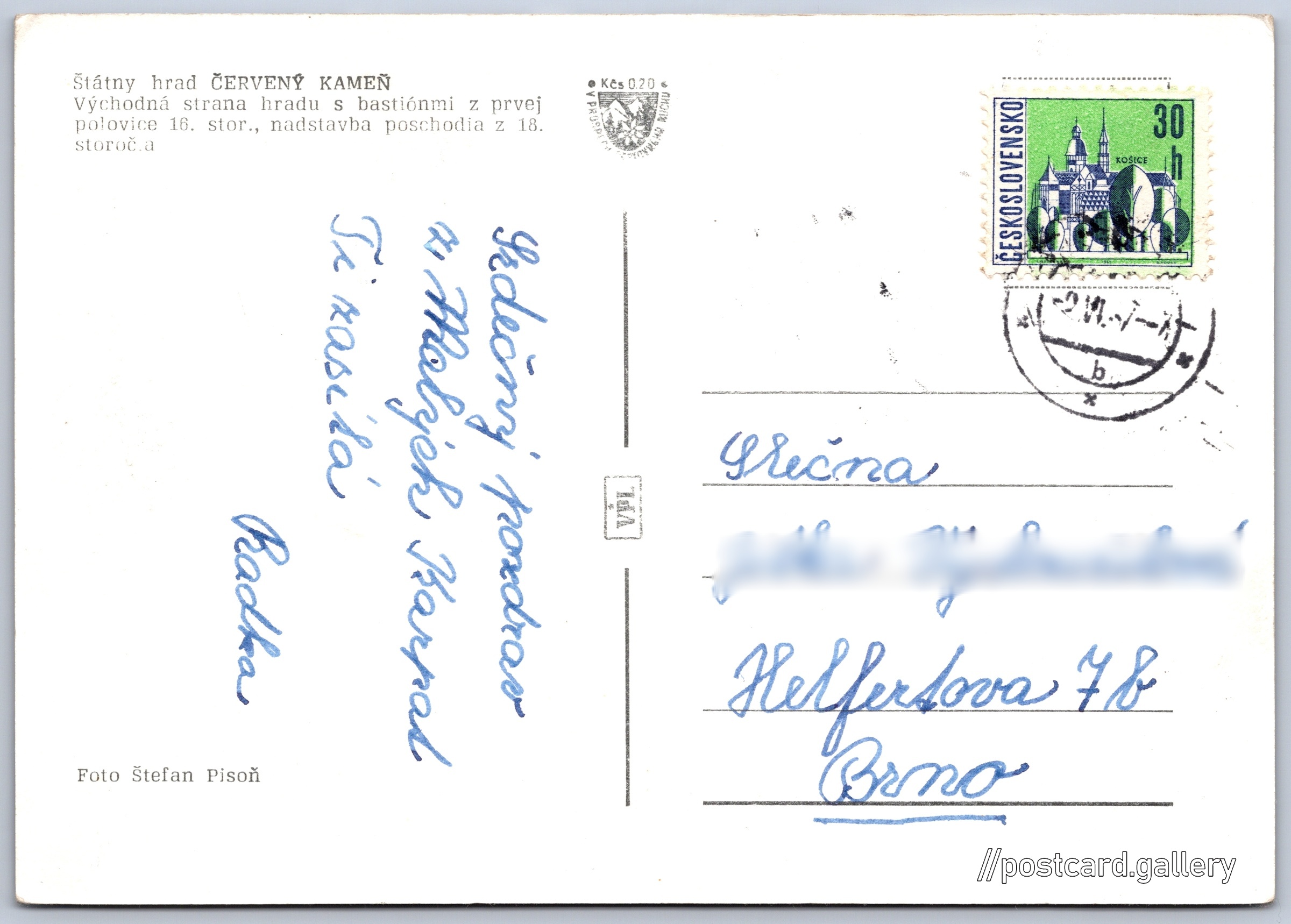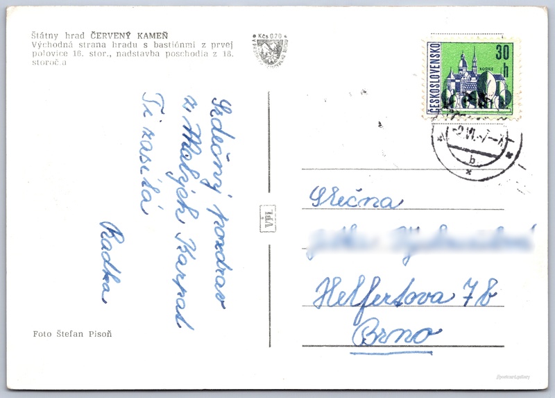 Státní hrad Červený Kameň Pokud chcete vidět pohlednice ve vyšším rozlišení nebo zobrazovat jejich zadní stranu, tak se prosím nejdříve přihlašte Přihlásit Zaregistrovat Štátny hrad ČERVENÝ KAMEŇVýchodná strana hradu s bastiónmi z prvej polovice 16. stor., nadstavba poschodia z 18. storočia Jazyk tištěného textu na pohlednici: slovenština Častá ukázat na mapě Vydavatel: VPL (Československo) Datum vydání není známo Pomozte nám odhadnout datum vzniku pohlednice Velikost (š x v) a tvar pohlednice: 145 x 102 mm (5.71" x 4.02"), obdélník Osoby spjaté s touto pohlednicí: Štefan Pisoň(Autor fotografie) Prošlá poštou Ceny: Příplatek na tur. ruch: 0,20 Kčs (CSK))Vyplacené známky: 0,30 Kčs (CSK) DiskuseVložit příspěvek Přidat novou složku ... Spravovat složky ...