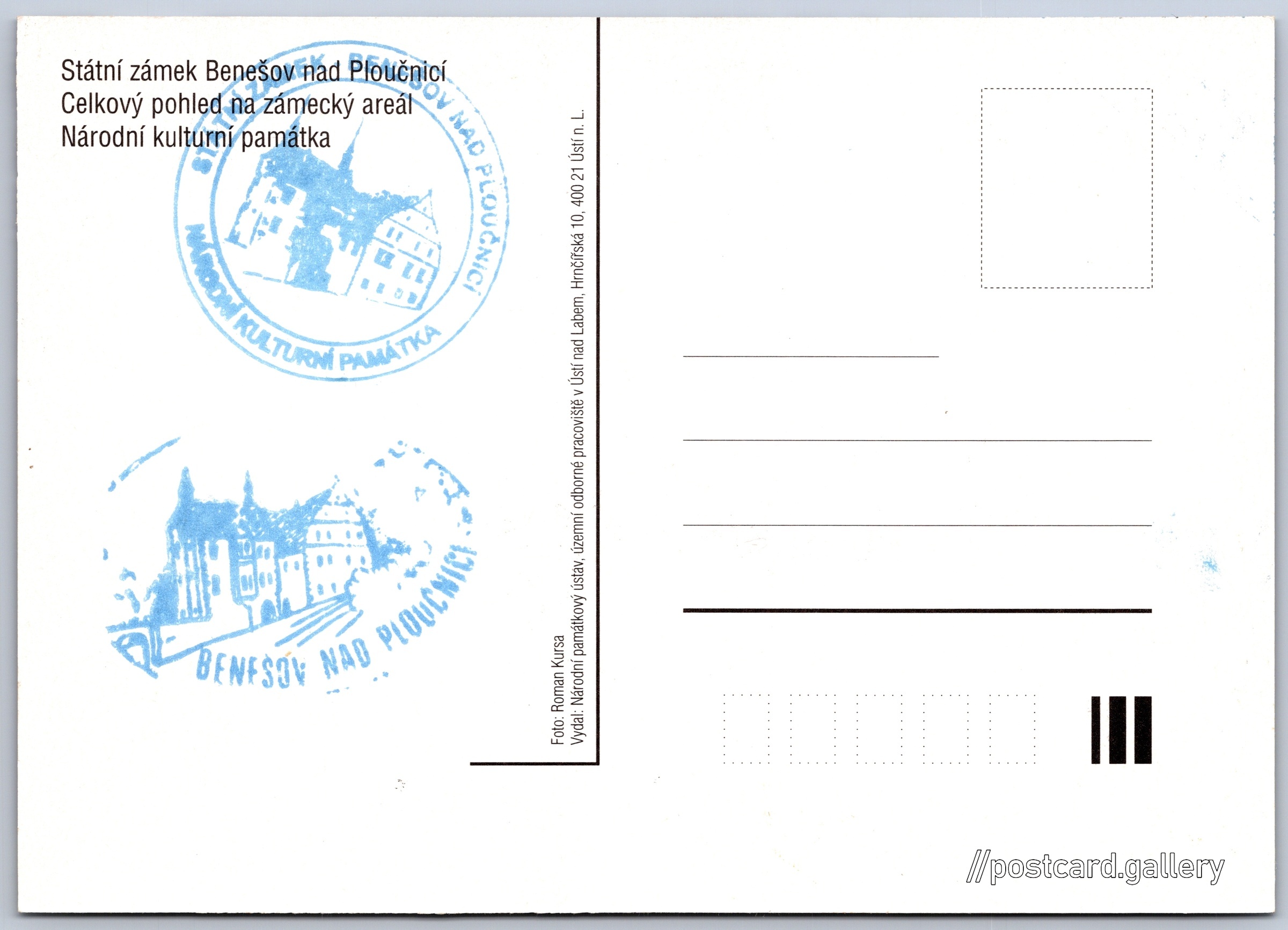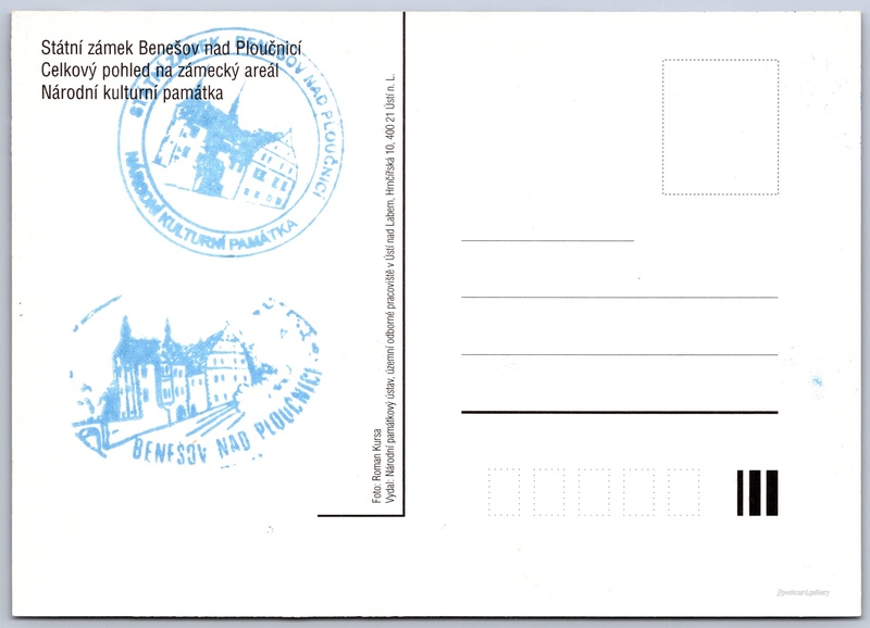 Státní zámek Benešov nad Ploučnicí, celkový pohled Pokud chcete vidět pohlednice ve vyšším rozlišení nebo zobrazovat jejich zadní stranu, tak se prosím nejdříve přihlašte Přihlásit Zaregistrovat Státní zámek Benešov nad PloučnicíCelkový pohled na zámecký areálNárodní kulturní památka Jazyk tištěného textu na pohlednici: čeština Benešov nad Ploučnicí, Děčín ukázat na mapě V blízkém okolí místa zobrazeného na pohlednici lze najít 4 jiné pohlednice. Zobrazit blízké pohlednice Vydavatel: Národní památkový ústav (Česko) Datum vydání není známo Pomozte nám odhadnout datum vzniku pohlednice Velikost (š x v) a tvar pohlednice: 148 x 105 mm (5.83" x 4.13"), obdélník Osoby spjaté s touto pohlednicí: Roman Kursa(Autor fotografie) Čistá pohlednice (neprošlá poštou) DiskuseVložit příspěvek Přidat novou složku ... Spravovat složky ...
