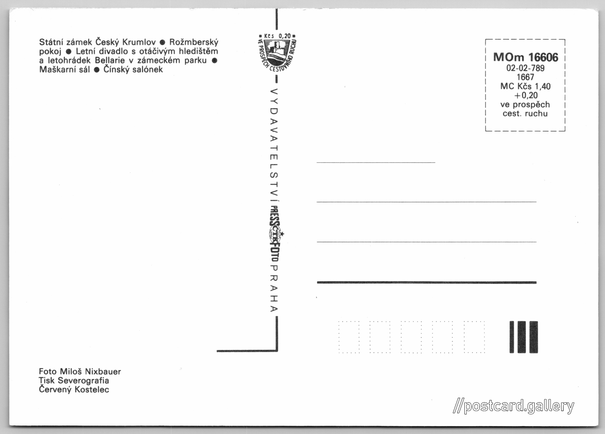 Statní zámek Český Krumlov Pokud chcete vidět pohlednice ve vyšším rozlišení nebo zobrazovat jejich zadní stranu, tak se prosím nejdříve přihlašte Přihlásit Zaregistrovat Statní zámek Český Krumlov - Státní zámek Český Krumlov- Rožmberský pokoj- Letní divadlo s otáčivým hledištěm a letohrádek Bellarie v zámeckém parku- Maškarní sál- Čínský salónek Jazyk tištěného textu na pohlednici: čeština Latrán, Český Krumlov, Český Krumlov ukázat na mapě V blízkém okolí místa zobrazeného na pohlednici lze najít 3 jiné pohlednice. Zobrazit blízké pohlednice Vydavatel: PressFoto Praha (Československo) Rok vydání pohlednice: 1987 Velikost (š x v) a tvar pohlednice: 148 x 105 mm (5.83" x 4.13"), obdélník Osoby spjaté s touto pohlednicí: Miloš Nixbauer(Autor fotografie) Čistá pohlednice (neprošlá poštou) Ceny: Cena pohlednice: 1,40 Kčs (CSK) (+0,20 Kčs přípl. na tur. ruch) Kódy na pohlednici: MOm 16606 02-02-789 1667 DiskuseVložit příspěvek Přidat novou složku ... Spravovat složky ...