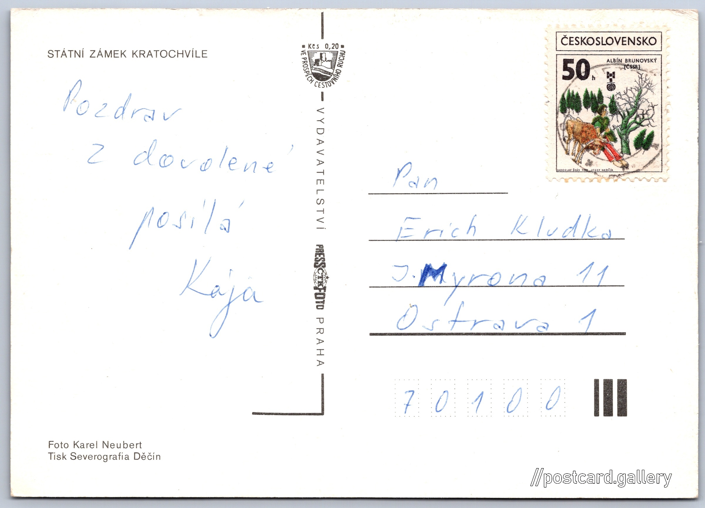 Státní zámek Kratochvíle Pokud chcete vidět pohlednice ve vyšším rozlišení nebo zobrazovat jejich zadní stranu, tak se prosím nejdříve přihlašte Přihlásit Zaregistrovat STÁTNÍ ZÁMEK KRATOCHVÍLE Jazyk tištěného textu na pohlednici: čeština Zámek Kratochvíle, Zámek, Petrův Dvůr 5, Netolice - Petrův Dvůr, Česko ukázat na mapě V blízkém okolí místa zobrazeného na pohlednici lze najít 2 jiné pohlednice. Zobrazit blízké pohlednice Vydavatel: PressFoto Praha (Československo) Datum vydání není známo Pomozte nám odhadnout datum vzniku pohlednice Velikost (š x v) a tvar pohlednice: 148 x 105 mm (5.83" x 4.13"), obdélník Osoby spjaté s touto pohlednicí: Karel Neubert(Autor fotografie) Prošlá poštou Ceny: Příplatek na tur. ruch: 0,20 Kčs (CSK))Vyplacené známky: 0,50 Kčs (CSK) DiskuseVložit příspěvek Přidat novou složku ... Spravovat složky ...