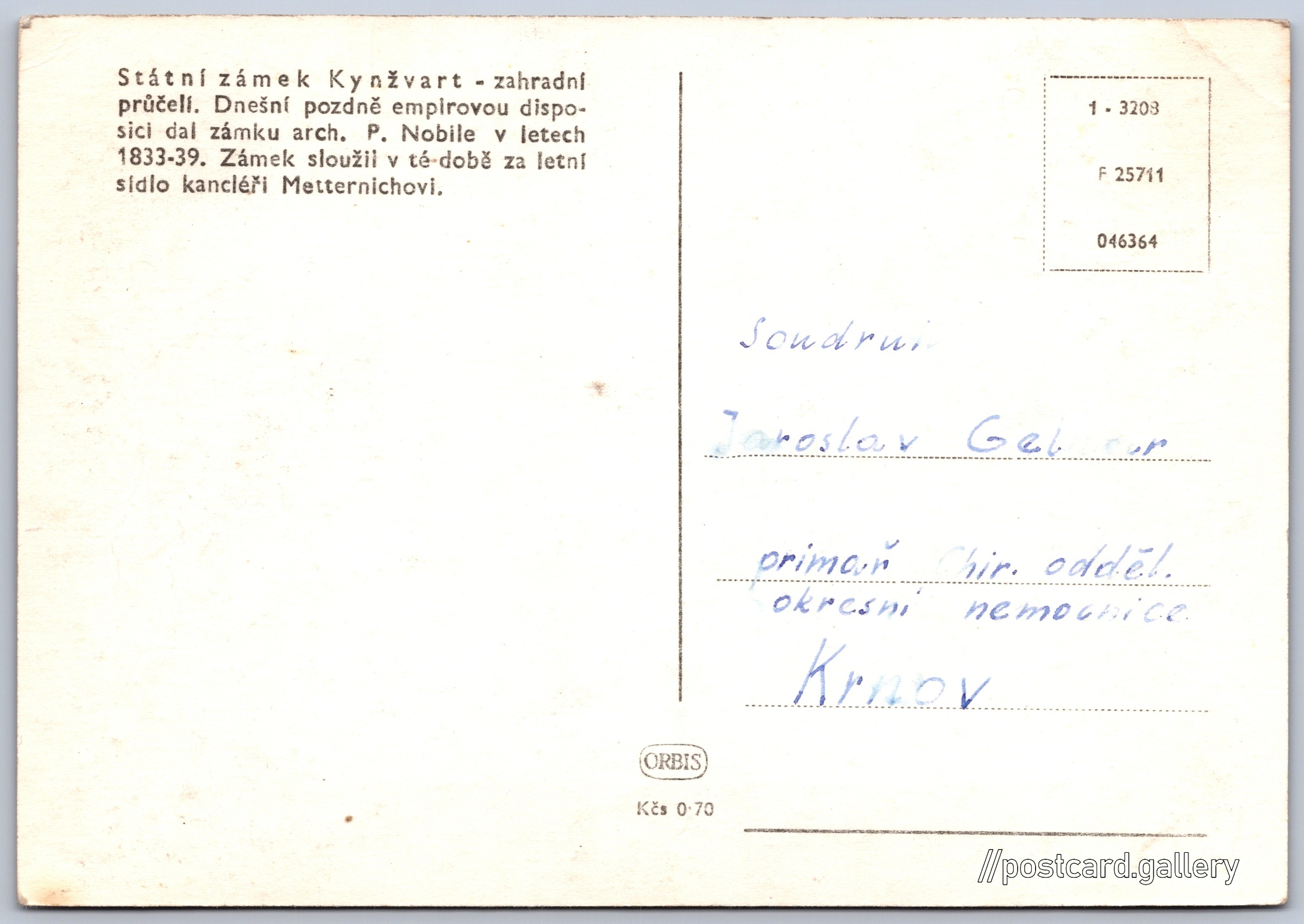 Státní zámek Kynžvart Pokud chcete vidět pohlednice ve vyšším rozlišení nebo zobrazovat jejich zadní stranu, tak se prosím nejdříve přihlašte Přihlásit Zaregistrovat Státní zámek Kynžvart - zahradní průčelí. Dnešní pozdně empirovou disposici dal zámku arch. P. Nobile v letech 1833-39. Zámek sloužil v té době za letní sídlo kancléři Metternichovi. Jazyk tištěného textu na pohlednici: čeština Zámek, Lázně Kynžvart, Cheb ukázat na mapě V blízkém okolí místa zobrazeného na pohlednici lze najít 4 jiné pohlednice. Zobrazit blízké pohlednice Vydavatel: Nakladatelství Orbis (Československo) Datum vydání není známo Pomozte nám odhadnout datum vzniku pohlednice Velikost (š x v) a tvar pohlednice: 147 x 103 mm (5.79" x 4.06"), obdélník Osoby spjaté s touto pohlednicí: Klemens Wenzel von Metternich(Obsah pohlednice) Peter Nobile(Obsah pohlednice) Prošlá poštou Ceny: Cena pohlednice: 0,70 Kčs (CSK) Kódy na pohlednici: 1-3208 F 25711 046364 DiskuseVložit příspěvek Přidat novou složku ... Spravovat složky ...