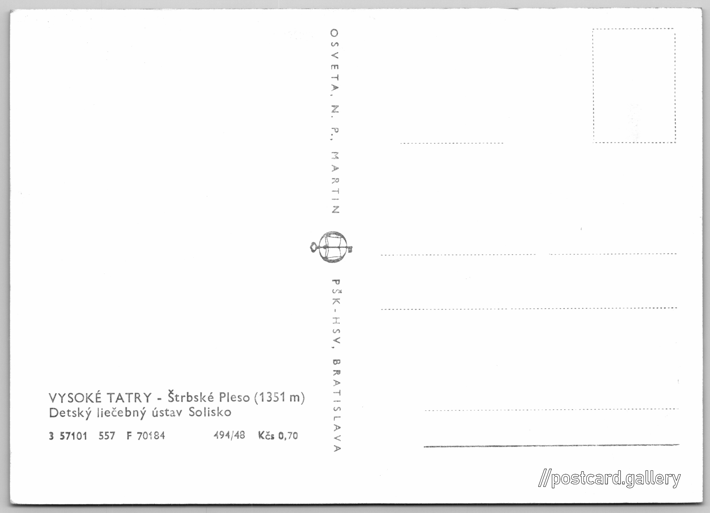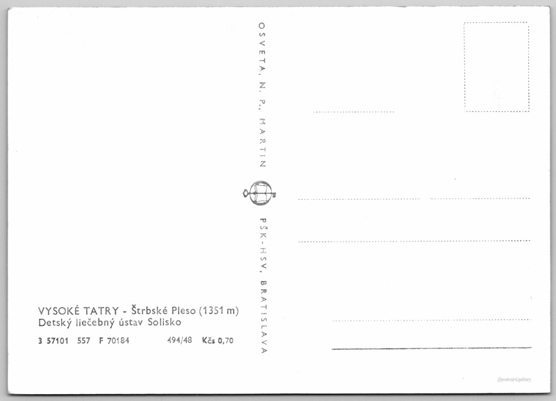 štrbské pleso, dětská léčebna Solisko Pokud chcete vidět pohlednice ve vyšším rozlišení nebo zobrazovat jejich zadní stranu, tak se prosím nejdříve přihlašte Přihlásit Zaregistrovat VYSOKÉ TATRY - Štrbské Pleso (1351 m)Detský liečebný ústav Solisko Jazyk tištěného textu na pohlednici: slovenština Pri jazere 4046/1 ukázat na mapě V blízkém okolí místa zobrazeného na pohlednici lze najít 79 jiných pohlednic. Zobrazit blízké pohlednice Vydavatel: Osveta, n. p., Martin PŠK - Bratislava (Československo) Rok vydání pohlednice: květen, 1957 Velikost (š x v) a tvar pohlednice: 147 x 104 mm (5.79" x 4.09"), obdélník Čistá pohlednice (neprošlá poštou) Ceny: Cena pohlednice: 0,70 Kčs (CSK) Kódy na pohlednici: 3 57101 557 F 70184 494/48 DiskuseVložit příspěvek Přidat novou složku ... Spravovat složky ...