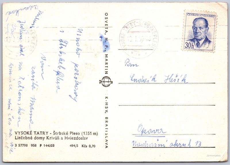 Štrbské pleso, léčebny Kriváň a Hviezdoslav Pokud chcete vidět pohlednice ve vyšším rozlišení nebo zobrazovat jejich zadní stranu, tak se prosím nejdříve přihlašte Přihlásit Zaregistrovat VYSOKÉ TATRY - Štrbské Pleso (1351 m)Liečebné domy Kriváň a Hviezdoslav Jazyk tištěného textu na pohlednici: slovenština Štrba - Štrbské pleso ukázat na mapě V blízkém okolí místa zobrazeného na pohlednici lze najít 79 jiných pohlednic. Zobrazit blízké pohlednice Vydavatel: Osveta, n. p., Martin PŠK - Bratislava (Československo) Rok vydání pohlednice: září, 1958 Velikost (š x v) a tvar pohlednice: 147 x 103 mm (5.79" x 4.06"), obdélník Prošlá poštou:Datum na razítku: 10.1.1960 Ceny: Cena pohlednice: 0,70 Kčs (CSK)Vyplacené známky: 0,30 Kčs (CSK) Kódy na pohlednici: 3 57798 958 F 144003 494/5 DiskuseVložit příspěvek Přidat novou složku ... Spravovat složky ...