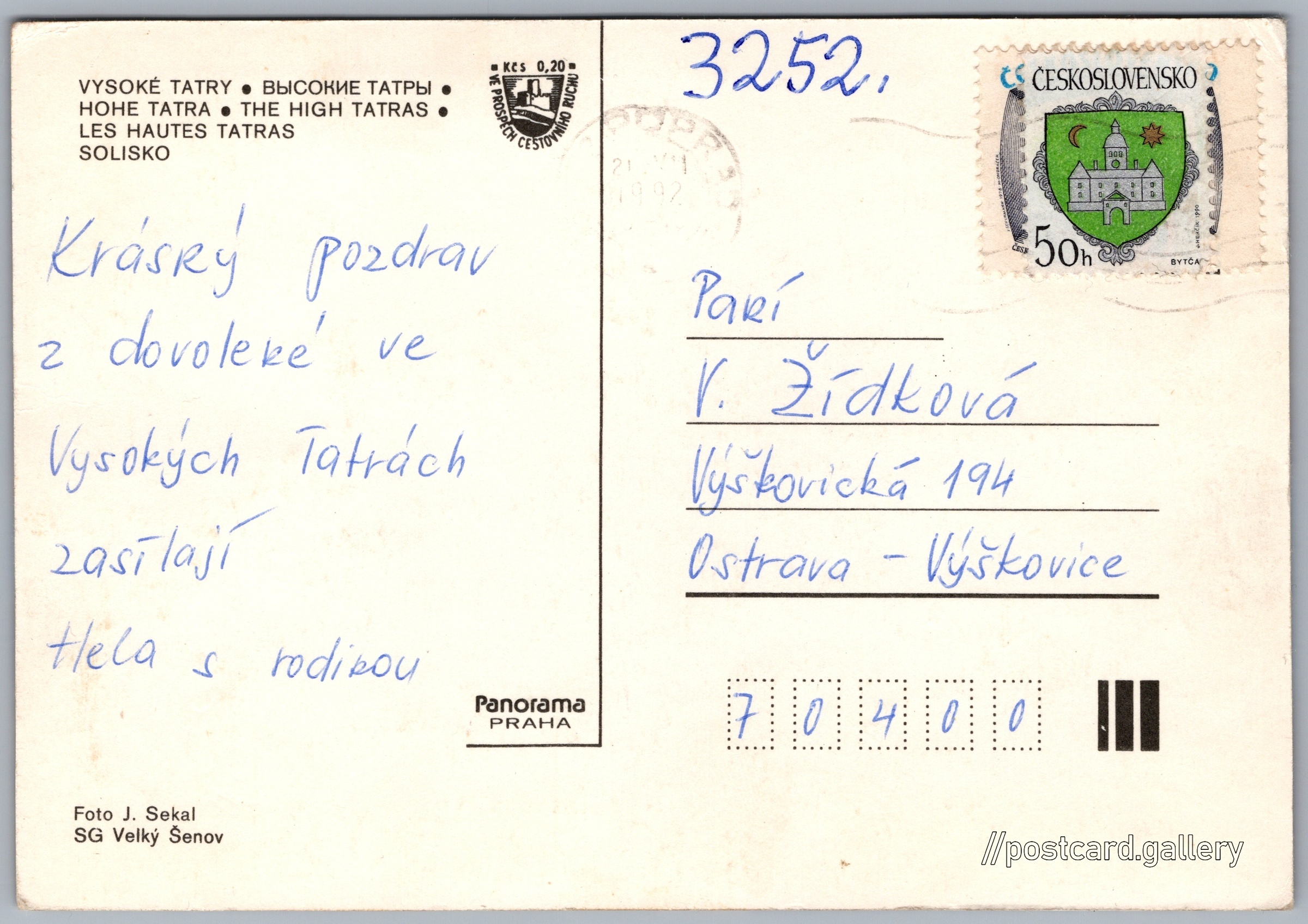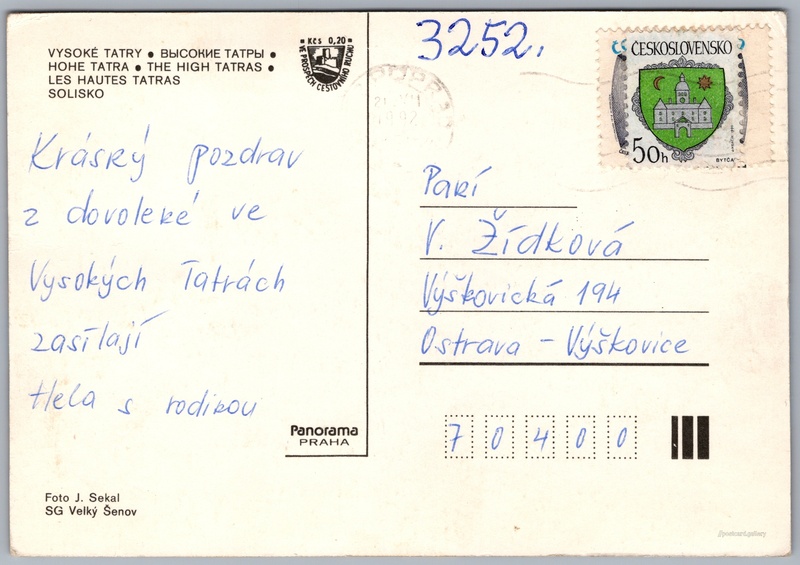 Štrbské Pleso, Solisko 5/83 Pokud chcete vidět pohlednice ve vyšším rozlišení nebo zobrazovat jejich zadní stranu, tak se prosím nejdříve přihlašte Přihlásit Zaregistrovat Štrbské Pleso, Solisko VYSOKÉ TATRY - ВЫСОКИЕ ТАТРЫ - HOHE TATRA - THE HIGH TATRAS - LES HAUTES TATRASSOLISKO Jazyk tištěného textu na pohlednici: čeština Chata pod Soliskom, Chata, bouda, K vodopádom 4097/45, Štrba, Slovensko ukázat na mapě V blízkém okolí místa zobrazeného na pohlednici lze najít 105 jiných pohlednic. Zobrazit blízké pohlednice Vydavatel: Panorama (Československo) Datum vydání není známo Pomozte nám odhadnout datum vzniku pohlednice Velikost (š x v) a tvar pohlednice: 148 x 104 mm (5.83" x 4.09"), obdélník Osoby spjaté s touto pohlednicí: Josef Sekal(Autor fotografie) Prošlá poštou Ceny: Příplatek na tur. ruch: 0,20 Kčs (CSK))Vyplacené známky: 0,50 Kčs (CSK) DiskuseVložit příspěvek Přidat novou složku ... Spravovat složky ...
