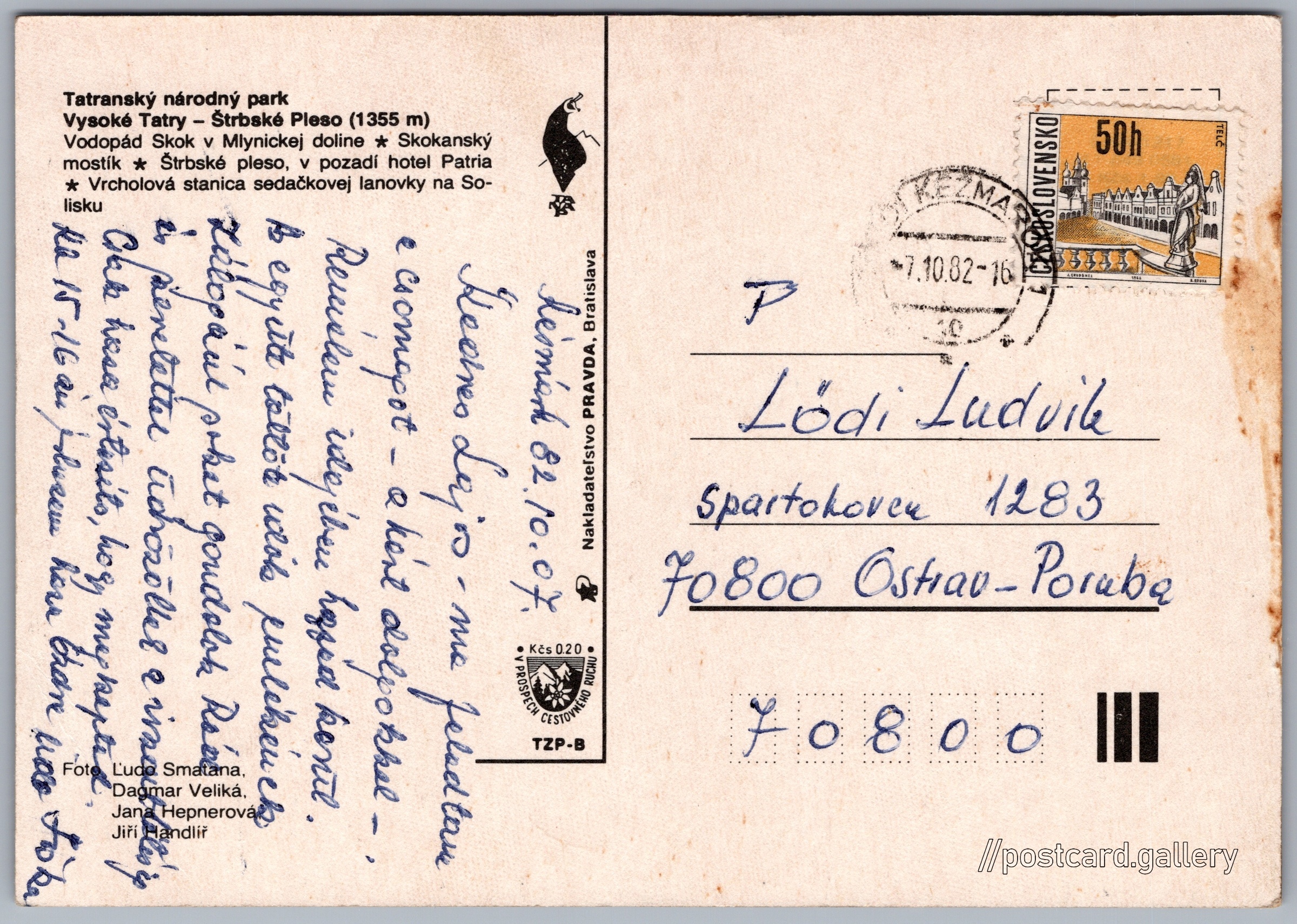 Štrbské Pleso Pokud chcete vidět pohlednice ve vyšším rozlišení nebo zobrazovat jejich zadní stranu, tak se prosím nejdříve přihlašte Přihlásit Zaregistrovat Štrbské Pleso Tatranský národný parkVysoké Tatry - Štrbské Pleso (1355 m)- Vodopád Skok v Mlynickej doline- Skokanský mostík- Štrbské pleso, v pozadí hotel Patria- Vrcholová stanica sedačkovej lanovky na Solisku Jazyk tištěného textu na pohlednici: slovenština Štrbské pleso, Vodní plocha, Štrba, Slovensko ukázat na mapě V blízkém okolí místa zobrazeného na pohlednici lze najít 109 jiných pohlednic. Zobrazit blízké pohlednice Vydavatel: Nakladateľstvo PRAVDA, Bratislava (Československo) Odhadované datum vydání pohlednice: 1979 - 1982 Pomozte nám zpřesnit rok vzniku pohlednice Velikost (š x v) a tvar pohlednice: 147 x 104 mm (5.79" x 4.09"), obdélník Osoby spjaté s touto pohlednicí: Ľudo Smatana(Autor fotografie) Dagmar Veliká(Autor fotografie) Jana Hepnerová(Autor fotografie) Jiří Handlíř(Autor fotografie) Prošlá poštou:Datum na razítku: 7.10.1982Datum napsání pohledu: 7.10.1982 Ceny: Příplatek na tur. ruch: 0,20 Kčs (CSK))Vyplacené známky: 0,50 Kčs (CSK) DiskuseVložit příspěvek Přidat novou složku ... Spravovat složky ...