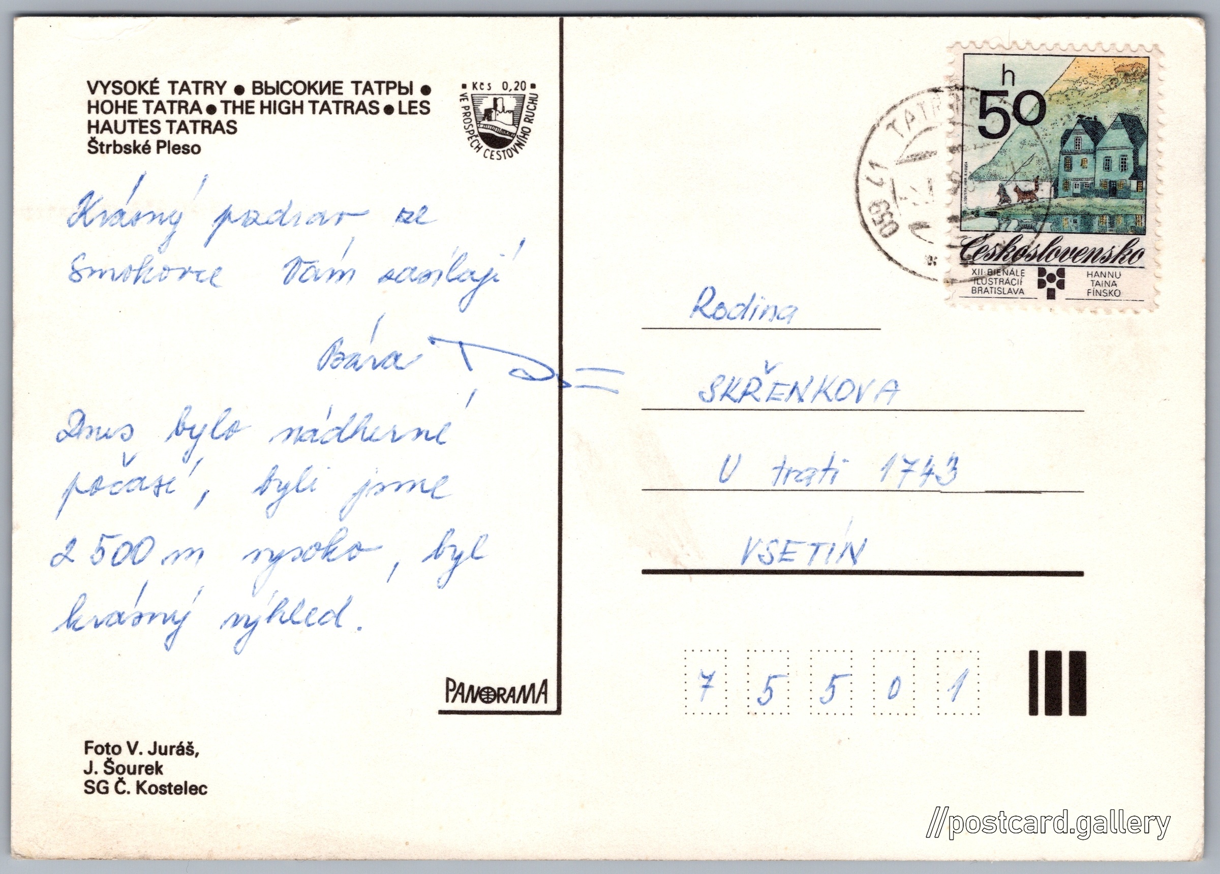 Štrbské pleso Pokud chcete vidět pohlednice ve vyšším rozlišení nebo zobrazovat jejich zadní stranu, tak se prosím nejdříve přihlašte Přihlásit Zaregistrovat Štrbské pleso VYSOKÉ TATRY - ВЫСОКИЕ ТАТРЫ - HOHE TATRA - THE HIGH TATRAS - LES HAUTES TATRASŠtrbské Pleso Jazyk tištěného textu na pohlednici: slovenština Štrbské Pleso, Vesnice, Slovensko ukázat na mapě V blízkém okolí místa zobrazeného na pohlednici lze najít 79 jiných pohlednic. Zobrazit blízké pohlednice Vydavatel: PressFoto Bratislava (Československo) Datum vydání není známo Pomozte nám odhadnout datum vzniku pohlednice Velikost (š x v) a tvar pohlednice: 149 x 105 mm (5.87" x 4.13"), obdélník Osoby spjaté s touto pohlednicí: V. Juráš(Autor fotografie) Jiří Šourek(Autor fotografie) Prošlá poštou Ceny: Příplatek na tur. ruch: 0,20 Kčs (CSK))Vyplacené známky: 0,50 Kčs (CSK) DiskuseVložit příspěvek Přidat novou složku ... Spravovat složky ...