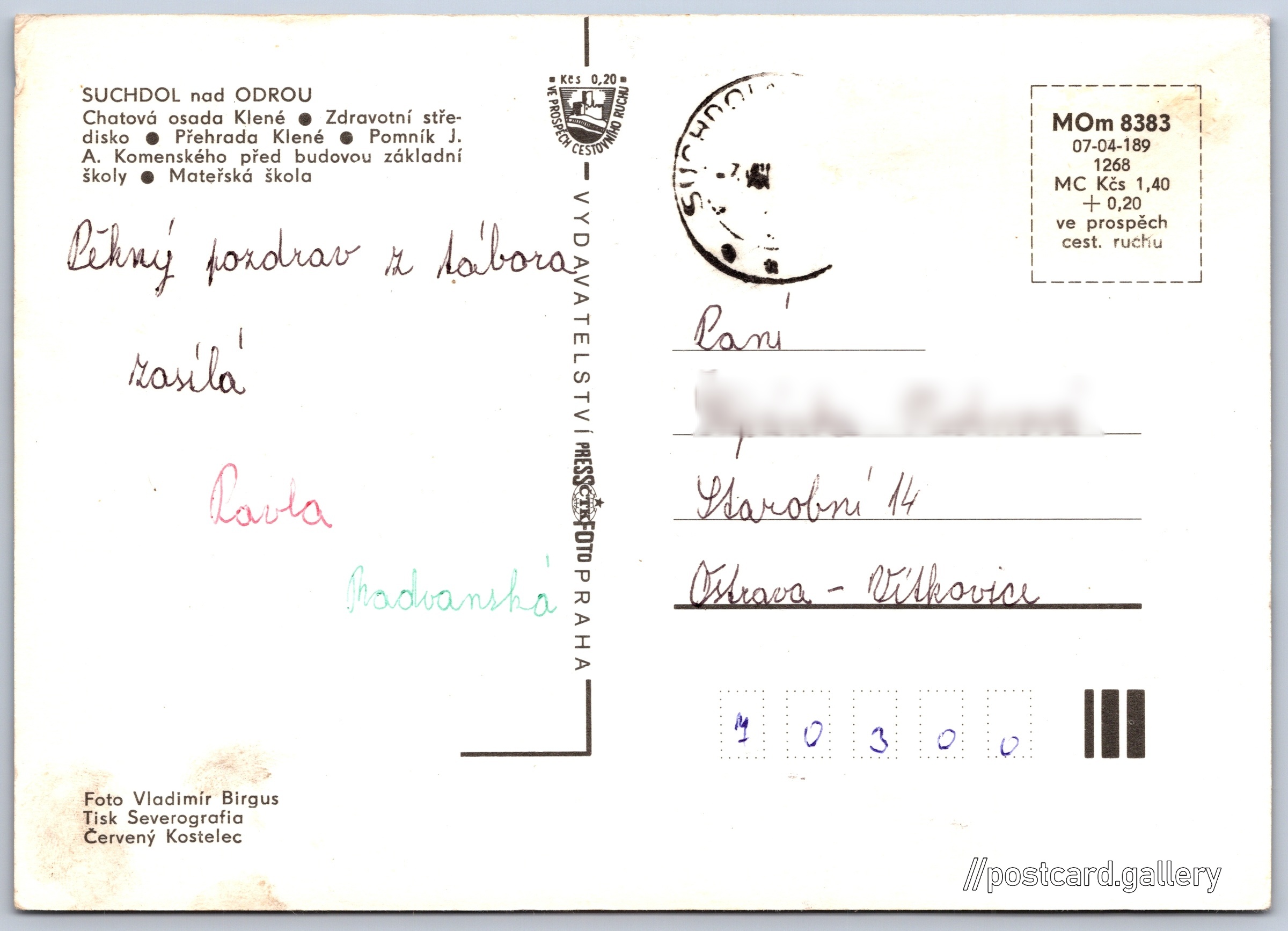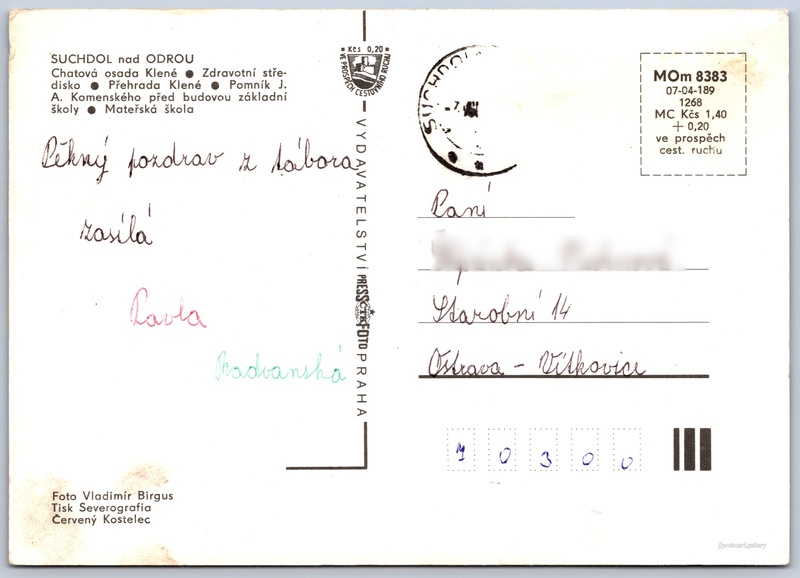 Suchdol nad Odrou Pokud chcete vidět pohlednice ve vyšším rozlišení nebo zobrazovat jejich zadní stranu, tak se prosím nejdříve přihlašte Přihlásit Zaregistrovat Suchdol nad Odrou SUCHDOL nad ODROU- Chatová osada Klené- Zdravotní středisko- Přehrada Klené- Pomník J. A. Komenského před budovou základní školy- Mateřská škola Jazyk tištěného textu na pohlednici: čeština Kletné, Suchdol nad Odrou, Nový Jičín ukázat na mapě Vydavatel: PressFoto Praha (Československo) Rok vydání pohlednice: 1981 Velikost (š x v) a tvar pohlednice: 148 x 105 mm (5.83" x 4.13"), obdélník Osoby spjaté s touto pohlednicí: Vladimír Birgus(Autor fotografie) Jan Amos Komenský(Obsah pohlednice) Prošlá poštou Ceny: Cena pohlednice: 1,40 Kčs (CSK) (+0,20 Kčs přípl. na tur. ruch) Kódy na pohlednici: MOm 8383 07-04-189 1268 DiskuseVložit příspěvek Přidat novou složku ... Spravovat složky ...