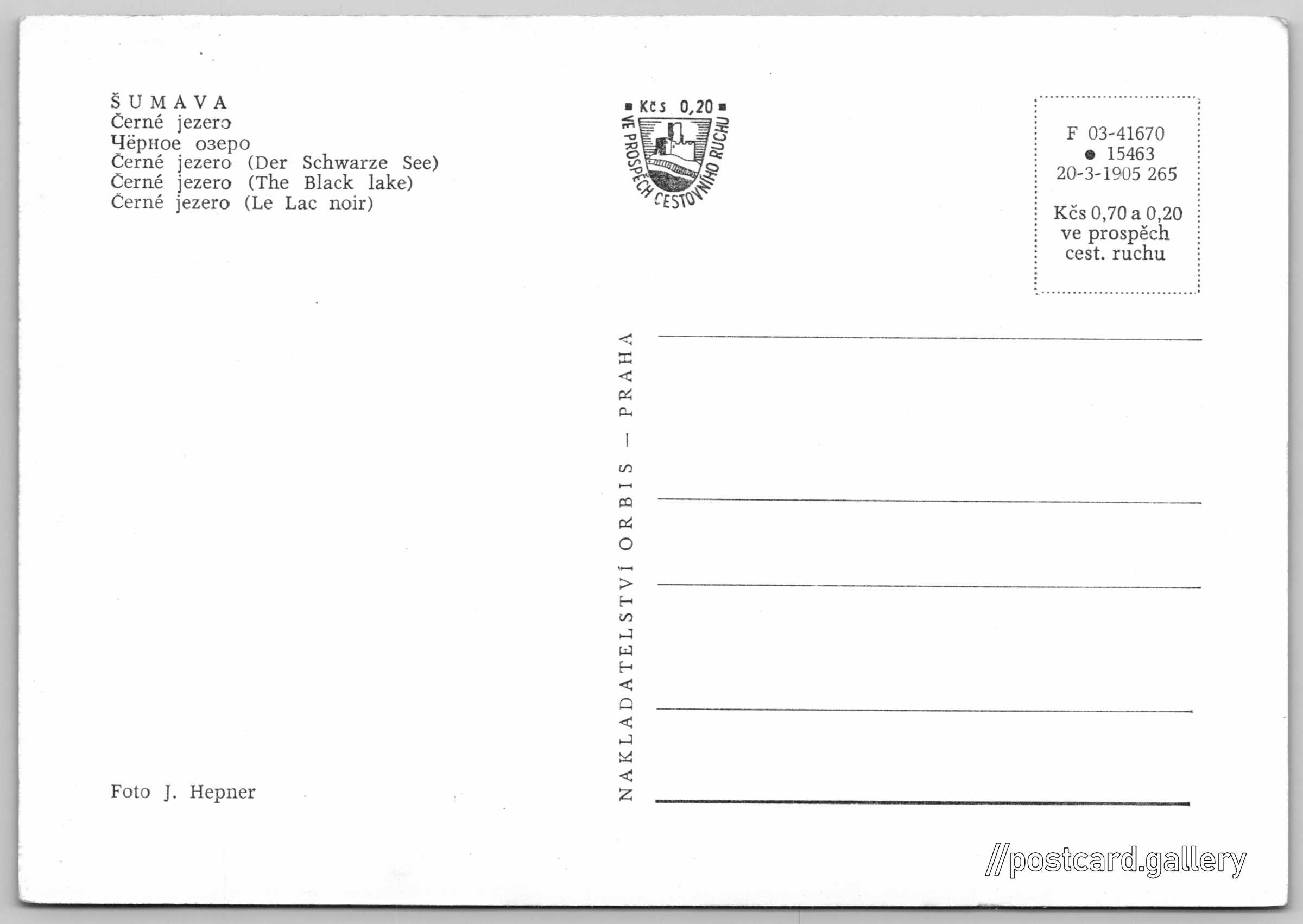 Šumava, Černé jezero Pokud chcete vidět pohlednice ve vyšším rozlišení nebo zobrazovat jejich zadní stranu, tak se prosím nejdříve přihlašte Přihlásit Zaregistrovat ŠUMAVA- Černé jezero- Чёрное озеро- Černé jezero (Der Schwarze See)- Černé jezero (The Black lake)- Černé jezero (Le Lac noir) Jazyk tištěného textu na pohlednici: čeština Černé jezero, Vodní plocha, Železná Ruda, Česko ukázat na mapě V blízkém okolí místa zobrazeného na pohlednici lze najít 10 jiných pohlednic. Zobrazit blízké pohlednice Vydavatel: Nakladatelství Orbis (Československo) Rok vydání pohlednice: únor, 1965 Velikost (š x v) a tvar pohlednice: 148 x 103 mm (5.83" x 4.06"), obdélník Osoby spjaté s touto pohlednicí: Jiří Hepner(Autor fotografie) Čistá pohlednice (neprošlá poštou) Ceny: Cena pohlednice: 0,70 Kčs (CSK) (+0,20 Kčs přípl. na tur. ruch) Kódy na pohlednici: F 03-41670 •15463 20-3-1905 265 DiskuseVložit příspěvek Přidat novou složku ... Spravovat složky ...