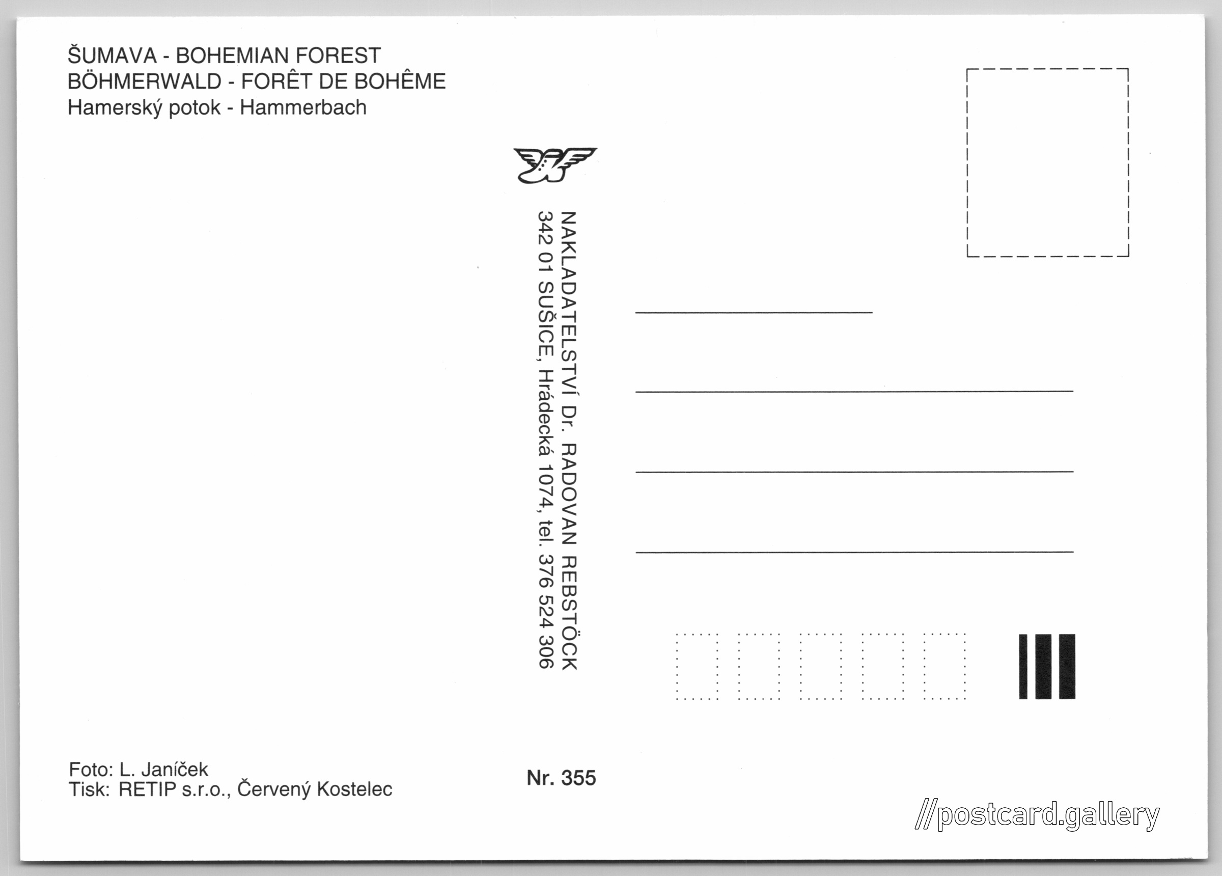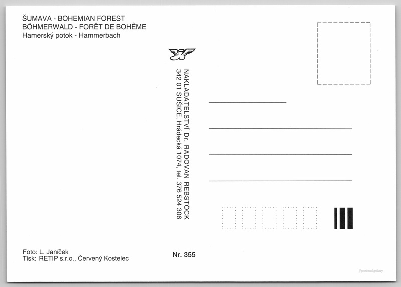 Šumava, Hamerský potok Pokud chcete vidět pohlednice ve vyšším rozlišení nebo zobrazovat jejich zadní stranu, tak se prosím nejdříve přihlašte Přihlásit Zaregistrovat ŠUMAVA - BOHEMIAN FORESTBÖHMERWALD - FORÊT DE BOHÊMEHamerský potok - Hammerbach Jazyky tištěného textu na pohlednici: čeština, angličtina, němčina, nizozemština Vydří Most, Kvilda, Prachatice ukázat na mapě Přesné místo není známo. Pokud jej znáte, tak jej prosím napište do komentářů nebo označte na mapě Vydavatel: Dr. Radovan Rebstöck (Česko) Datum vydání není známo Pomozte nám odhadnout datum vzniku pohlednice Velikost (š x v) a tvar pohlednice: 147 x 105 mm (5.79" x 4.13"), obdélník Osoby spjaté s touto pohlednicí: L. Janíček(Autor fotografie) Čistá pohlednice (neprošlá poštou) Kódy na pohlednici: 355 DiskuseVložit příspěvek Přidat novou složku ... Spravovat složky ...