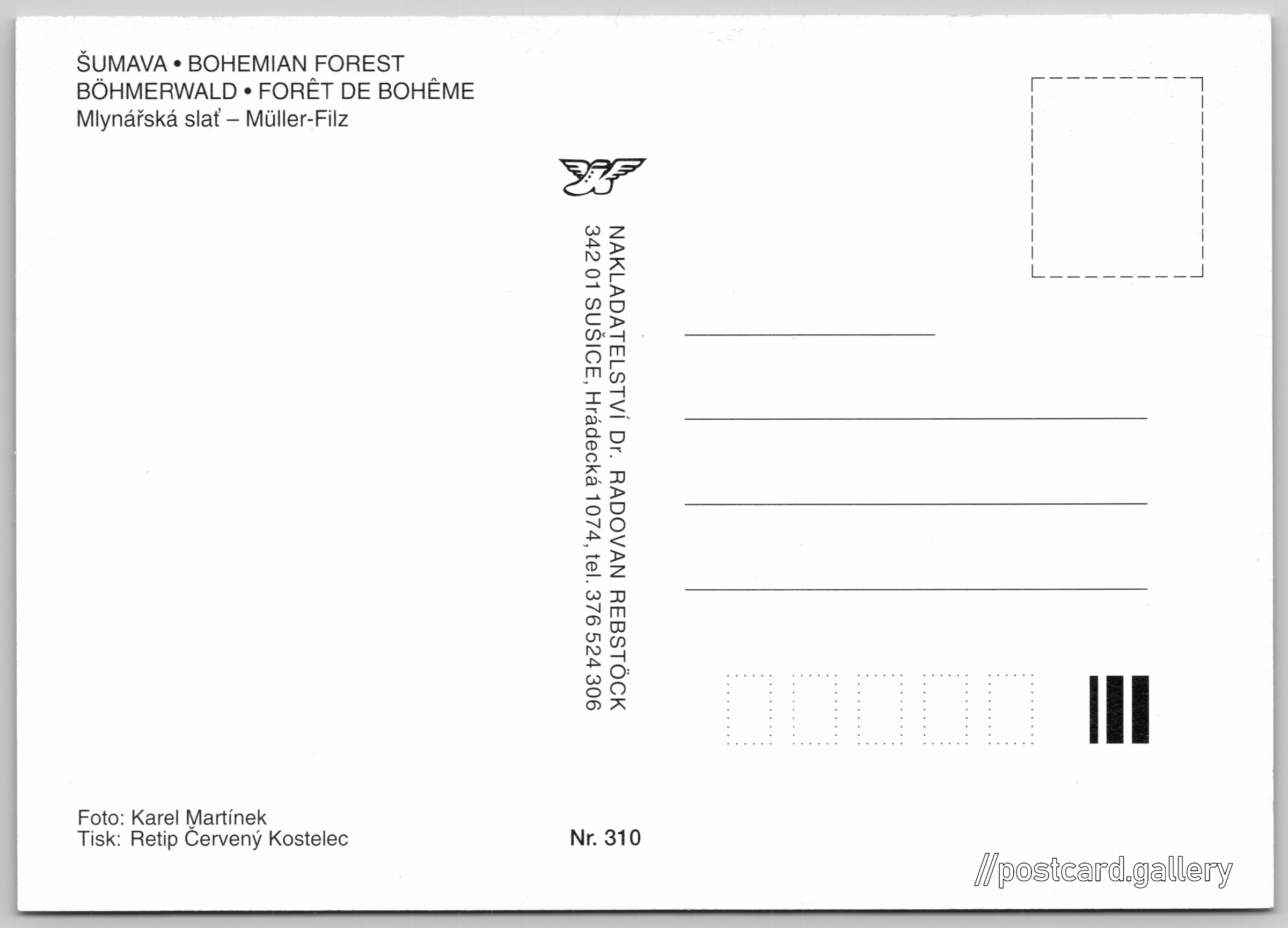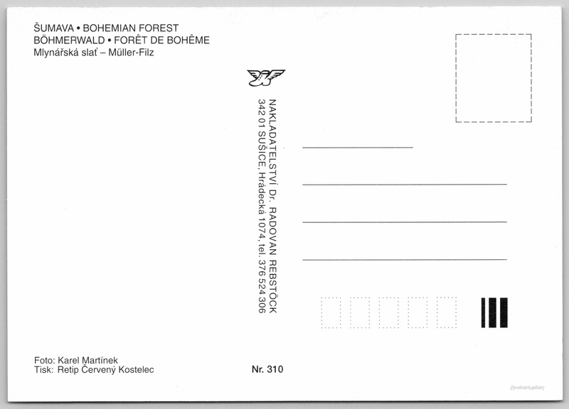 Šumava, Mlynářská slať Pokud chcete vidět pohlednice ve vyšším rozlišení nebo zobrazovat jejich zadní stranu, tak se prosím nejdříve přihlašte Přihlásit Zaregistrovat Bohemian Forest, Mlynářská slať ŠUMAVA - BOHEMIAN FORESTBÖHMERWALD - FORÊT DE BOHÊMEMlynářská slať - Müller-Filz Jazyky tištěného textu na pohlednici: čeština, angličtina, němčina, nizozemština Modrava, Klatovy ukázat na mapě V blízkém okolí místa zobrazeného na pohlednici lze najít 2 jiné pohlednice. Zobrazit blízké pohlednice Vydavatel: Dr. Radovan Rebstöck (Česko) Datum vydání není známo Pomozte nám odhadnout datum vzniku pohlednice Velikost (š x v) a tvar pohlednice: 147 x 105 mm (5.79" x 4.13"), obdélník Osoby spjaté s touto pohlednicí: Karel Martínek(Autor fotografie) Čistá pohlednice (neprošlá poštou) Kódy na pohlednici: 310 DiskuseVložit příspěvek Přidat novou složku ... Spravovat složky ...