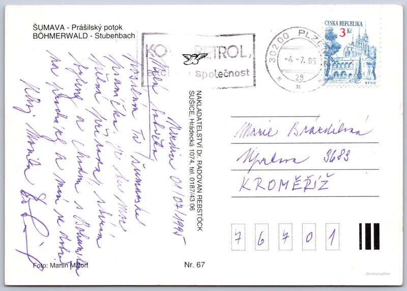 Šumava, Prášilský potok Pokud chcete vidět pohlednice ve vyšším rozlišení nebo zobrazovat jejich zadní stranu, tak se prosím nejdříve přihlašte Přihlásit Zaregistrovat ŠUMAVA - Prášilský potokBÖHMERWALD - Stubenbach Jazyky tištěného textu na pohlednici: čeština, němčina Prášilský potok, Potok, Česko ukázat na mapě Přesné místo není známo. Pokud jej znáte, tak jej prosím napište do komentářů nebo označte na mapě Vydavatel: Dr. Radovan Rebstöck (Česko) Odhadované datum vydání pohlednice: 1992 - 1995 Pomozte nám zpřesnit rok vzniku pohlednice Velikost (š x v) a tvar pohlednice: 148 x 104 mm (5.83" x 4.09"), obdélník Osoby spjaté s touto pohlednicí: Martin Milfort(Autor fotografie) Prošlá poštou:Datum na razítku: 4.7.1995Datum napsání pohledu: 1.7.1995 Ceny: Vyplacené známky: 3,00 Kč (CZK) Kódy na pohlednici: 67 DiskuseVložit příspěvek Přidat novou složku ... Spravovat složky ...