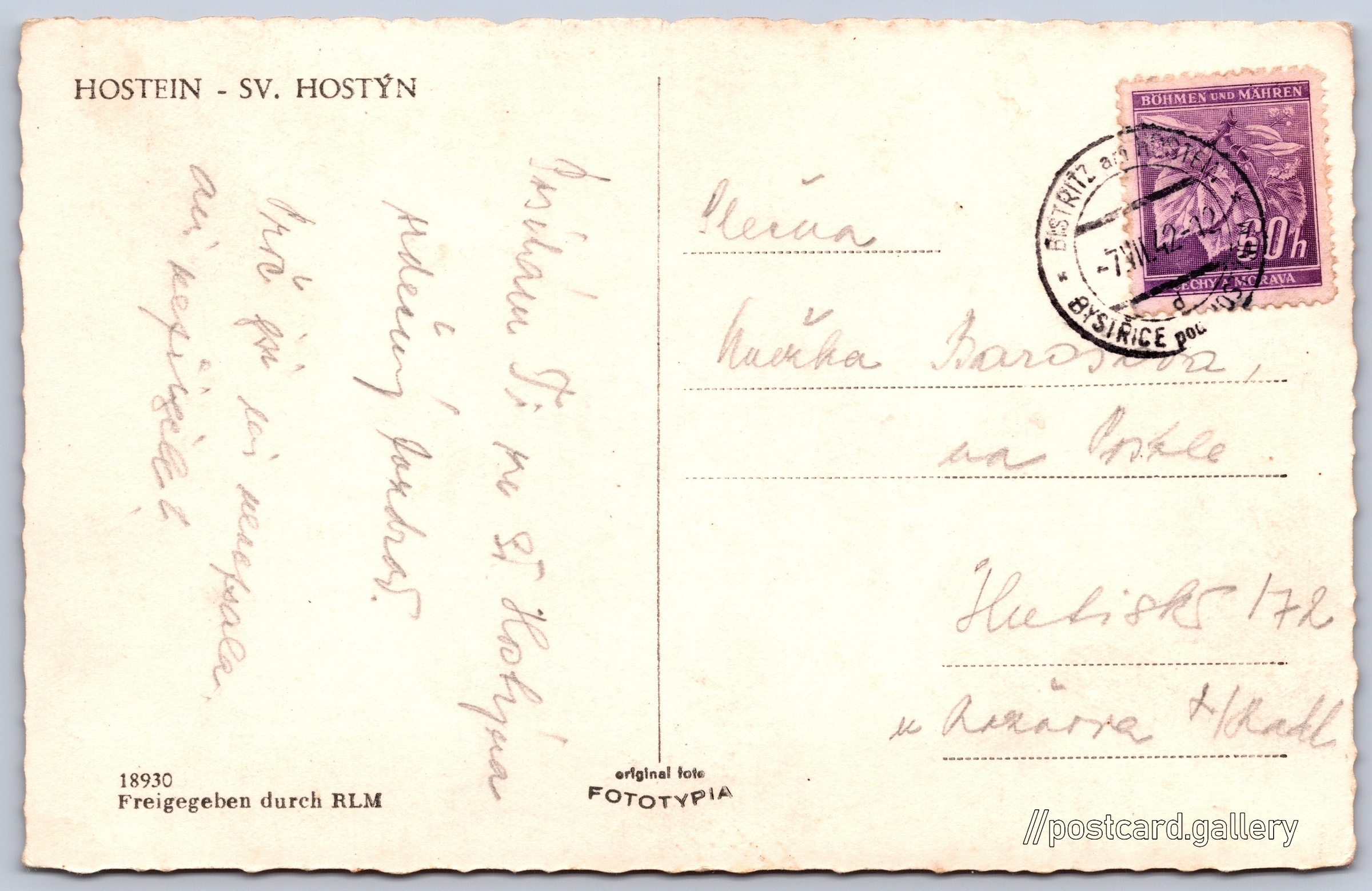 Sv. Hostýn 10/16 Pokud chcete vidět pohlednice ve vyšším rozlišení nebo zobrazovat jejich zadní stranu, tak se prosím nejdříve přihlašte Přihlásit Zaregistrovat HOSTEIN - SV. HOSTÝNFreigegeben durch RLM Jazyky tištěného textu na pohlednici: němčina, čeština Svatý Hostýn 107, 768 72 Chvalčov, Czechia ukázat na mapě V blízkém okolí místa zobrazeného na pohlednici lze najít 16 jiných pohlednic. Zobrazit blízké pohlednice Vydavatel: Fototypia - Vyškov (Československo) Odhadované datum vydání pohlednice: 1939 - 1942 Pomozte nám zpřesnit rok vzniku pohlednice Velikost (š x v) a tvar pohlednice: 139 x 89 mm (5.47" x 3.50"), obdélník, zoubkovaný Prošlá poštou:Datum na razítku: 7.7.1942 Ceny: Vyplacené známky: 0,60 Kčs (CSK) Kódy na pohlednici: 18930 DiskuseVložit příspěvek Přidat novou složku ... Spravovat složky ...
