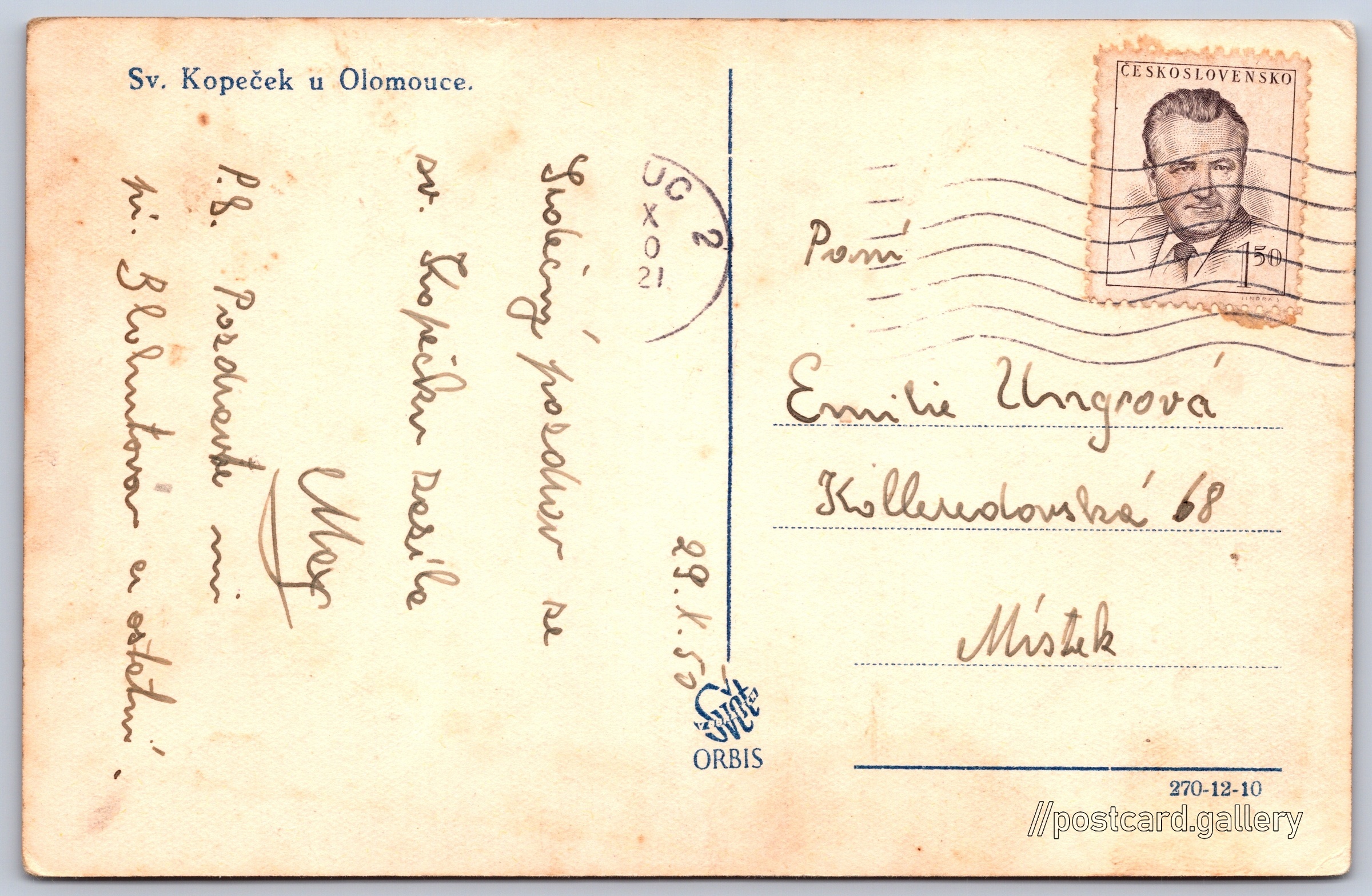 Sv. Kopeček u Olomouce Pokud chcete vidět pohlednice ve vyšším rozlišení nebo zobrazovat jejich zadní stranu, tak se prosím nejdříve přihlašte Přihlásit Zaregistrovat Sv. Kopeček u Olomouce. Jazyk tištěného textu na pohlednici: čeština Bazilika Navštívení Panny Marie na Svatém kopečku, Kostel, Návrší Jana Pavla II. 1/1, Olomouc - Svatý Kopeček, Česko ukázat na mapě V blízkém okolí místa zobrazeného na pohlednici lze najít 4 jiné pohlednice. Zobrazit blízké pohlednice Vydavatel: Nakladatelství Orbis (Československo) Odhadované datum vydání pohlednice: 1947 - 1950 Pomozte nám zpřesnit rok vzniku pohlednice Velikost (š x v) a tvar pohlednice: 140 x 91 mm (5.51" x 3.58"), obdélník Prošlá poštou:Datum napsání pohledu: 29.10.1950 Ceny: Vyplacené známky: 1,50 Kčs (CSK) Kódy na pohlednici: 270-12-10 DiskuseVložit příspěvek Přidat novou složku ... Spravovat složky ...