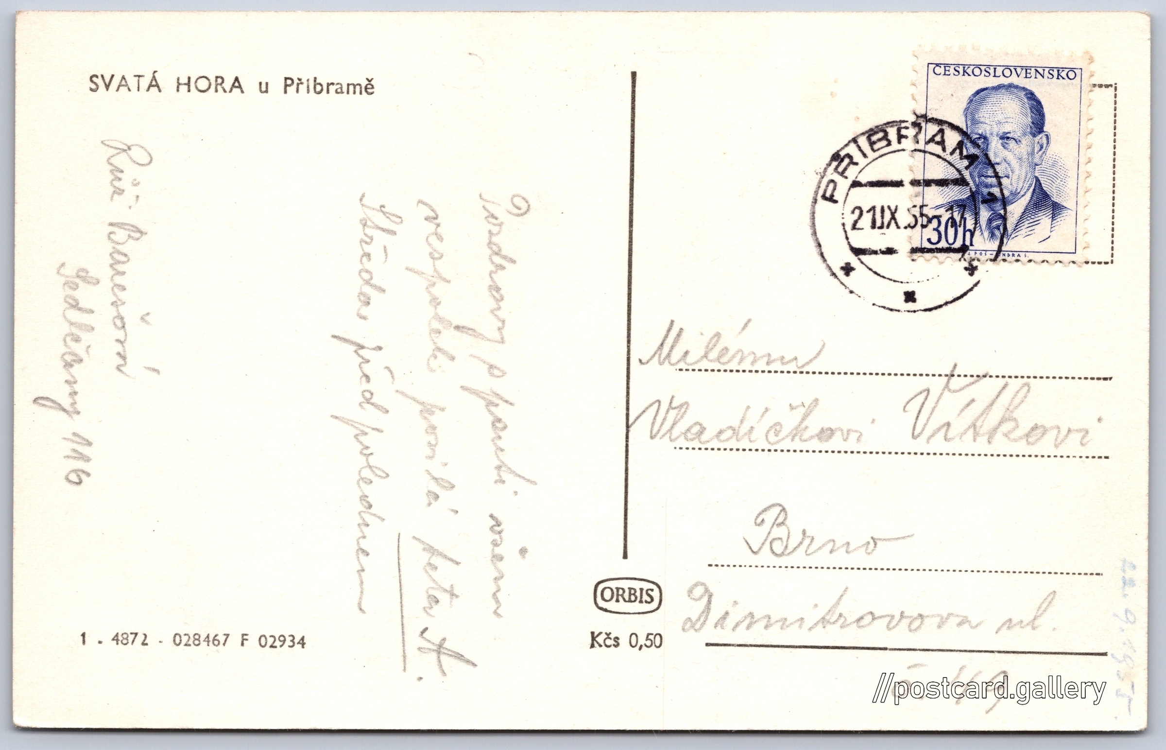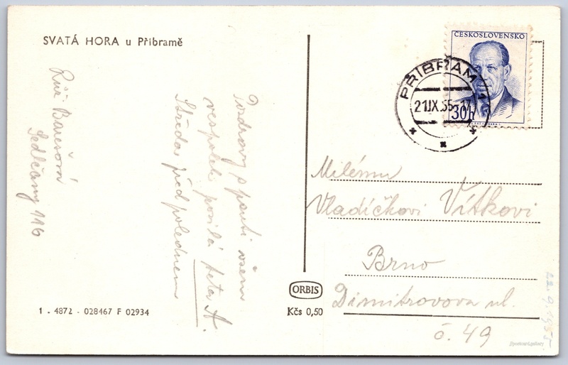 Svatá hora u Příbrami Pokud chcete vidět pohlednice ve vyšším rozlišení nebo zobrazovat jejich zadní stranu, tak se prosím nejdříve přihlašte Přihlásit Zaregistrovat SVATÁ HORA u Příbramě Jazyk tištěného textu na pohlednici: čeština Příbram II, Příbram, Příbram ukázat na mapě V blízkém okolí místa zobrazeného na pohlednici lze najít 6 jiných pohlednic. Zobrazit blízké pohlednice Vydavatel: Nakladatelství Orbis (Československo) Odhadované datum vydání pohlednice: 1952 - 1955 Pomozte nám zpřesnit rok vzniku pohlednice Velikost (š x v) a tvar pohlednice: 139 x 89 mm (5.47" x 3.50"), obdélník Prošlá poštou:Datum na razítku: 21.9.1955 Ceny: Cena pohlednice: 0,50 Kčs (CSK)Vyplacené známky: 0,30 Kčs (CSK) Kódy na pohlednici: 1-4872 028467 F 02934 DiskuseVložit příspěvek Přidat novou složku ... Spravovat složky ...