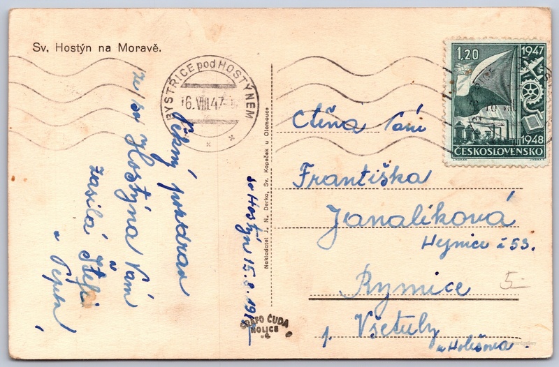 Svatý Hostýn na Moravě Pokud chcete vidět pohlednice ve vyšším rozlišení nebo zobrazovat jejich zadní stranu, tak se prosím nejdříve přihlašte Přihlásit Zaregistrovat Sv. Hostýn na Moravě. Jazyk tištěného textu na pohlednici: čeština Chvalčov, Kroměříž ukázat na mapě V blízkém okolí místa zobrazeného na pohlednici lze najít 16 jiných pohlednic. Zobrazit blízké pohlednice Vydavatel: Grafo Čuda Holice (Československo)J. N. Derka (Československo) Odhadované datum vydání pohlednice: 1945 - 1947 Pomozte nám zpřesnit rok vzniku pohlednice Velikost (š x v) a tvar pohlednice: 139 x 90 mm (5.47" x 3.54"), obdélník Prošlá poštou:Datum na razítku: 16.8.1947Datum napsání pohledu: 15.8.1947 Ceny: Vyplacené známky: 1,20 Kčs (CSK) DiskuseVložit příspěvek Přidat novou složku ... Spravovat složky ...