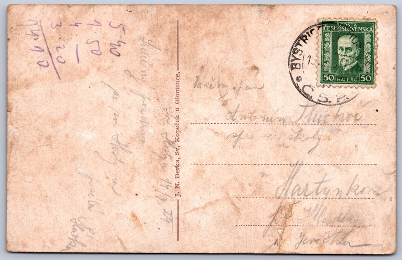 Svatý Hostýn na Moravě Pokud chcete vidět pohlednice ve vyšším rozlišení nebo zobrazovat jejich zadní stranu, tak se prosím nejdříve přihlašte Přihlásit Zaregistrovat Svatý Hostýn na Moravě Jazyk tištěného textu na pohlednici: čeština Chvalčov, Kroměříž ukázat na mapě V blízkém okolí místa zobrazeného na pohlednici lze najít 16 jiných pohlednic. Zobrazit blízké pohlednice Vydavatel: J. N. Derka (Československo) Odhadované datum vydání pohlednice: 1926 - 1929 Pomozte nám zpřesnit rok vzniku pohlednice Velikost (š x v) a tvar pohlednice: 139 x 89 mm (5.47" x 3.50"), obdélník Prošlá poštou:Datum na razítku: 15.7.1929Datum napsání pohledu: 14.7.1929 Ceny: Vyplacené známky: 0,50 Kčs (CSK) DiskuseVložit příspěvek Přidat novou složku ... Spravovat složky ...