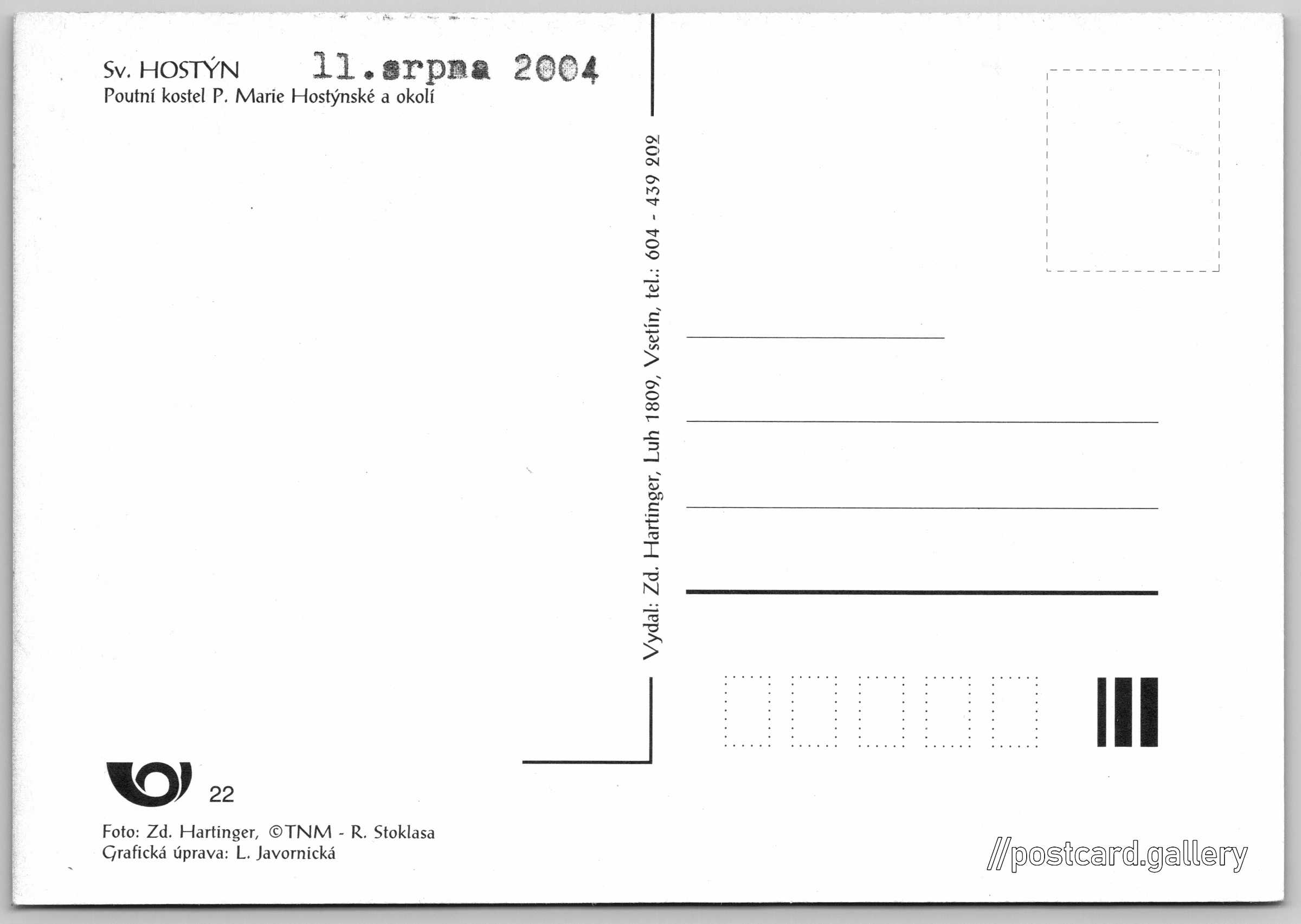 Svatý Hostýn Pokud chcete vidět pohlednice ve vyšším rozlišení nebo zobrazovat jejich zadní stranu, tak se prosím nejdříve přihlašte Přihlásit Zaregistrovat Sv. Hostýn Sv. HOSTÝNPoutní kostel P. Marie Hostýnské a okolí Jazyk tištěného textu na pohlednici: čeština Svatý Hostýn 107, 768 72 Chvalčov, Czechia ukázat na mapě V blízkém okolí místa zobrazeného na pohlednici lze najít 16 jiných pohlednic. Zobrazit blízké pohlednice Odhadované datum vydání pohlednice: 2002 - 2004 Pomozte nám zpřesnit rok vzniku pohlednice Velikost (š x v) a tvar pohlednice: 147 x 101 mm (5.79" x 3.98"), obdélník Osoby spjaté s touto pohlednicí: Zd. Hartinger(Autor fotografie) L. Javornická(Design pohlednice) Čistá pohlednice (neprošlá poštou) Kódy na pohlednici: 22 DiskuseVložit příspěvek Přidat novou složku ... Spravovat složky ...