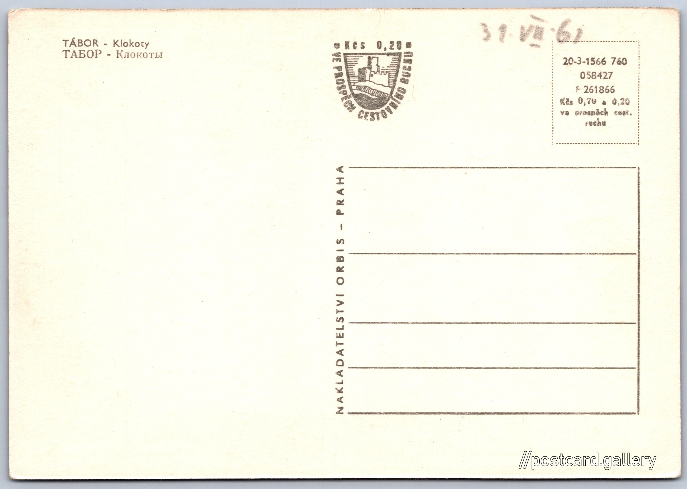 Tábor, Klokoty Pokud chcete vidět pohlednice ve vyšším rozlišení nebo zobrazovat jejich zadní stranu, tak se prosím nejdříve přihlašte Přihlásit Zaregistrovat TÁBOR - KlokotyТАБОР - Клокоты Jazyk tištěného textu na pohlednici: ruština Staroklokotská 1, Tábor, 390 03, Tábor ukázat na mapě V blízkém okolí místa zobrazeného na pohlednici lze najít 7 jiných pohlednic. Zobrazit blízké pohlednice Vydavatel: Nakladatelství Orbis (Československo) Rok vydání pohlednice: červenec, 1960 Velikost (š x v) a tvar pohlednice: 147 x 103 mm (5.79" x 4.06"), obdélník Čistá pohlednice (neprošlá poštou) Ceny: Cena pohlednice: 0,70 Kčs (CSK) (+0,20 Kčs přípl. na tur. ruch) Kódy na pohlednici: 20-3-1566 760 058427 261866 DiskuseVložit příspěvek Přidat novou složku ... Spravovat složky ...