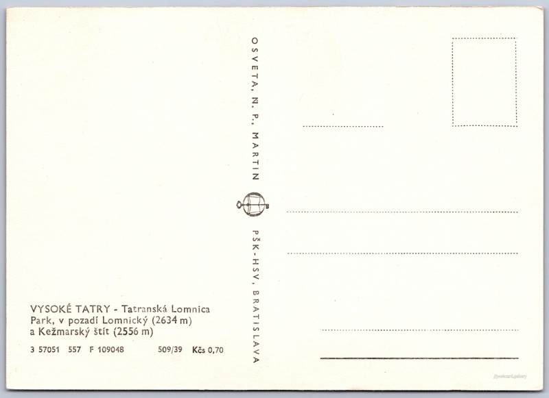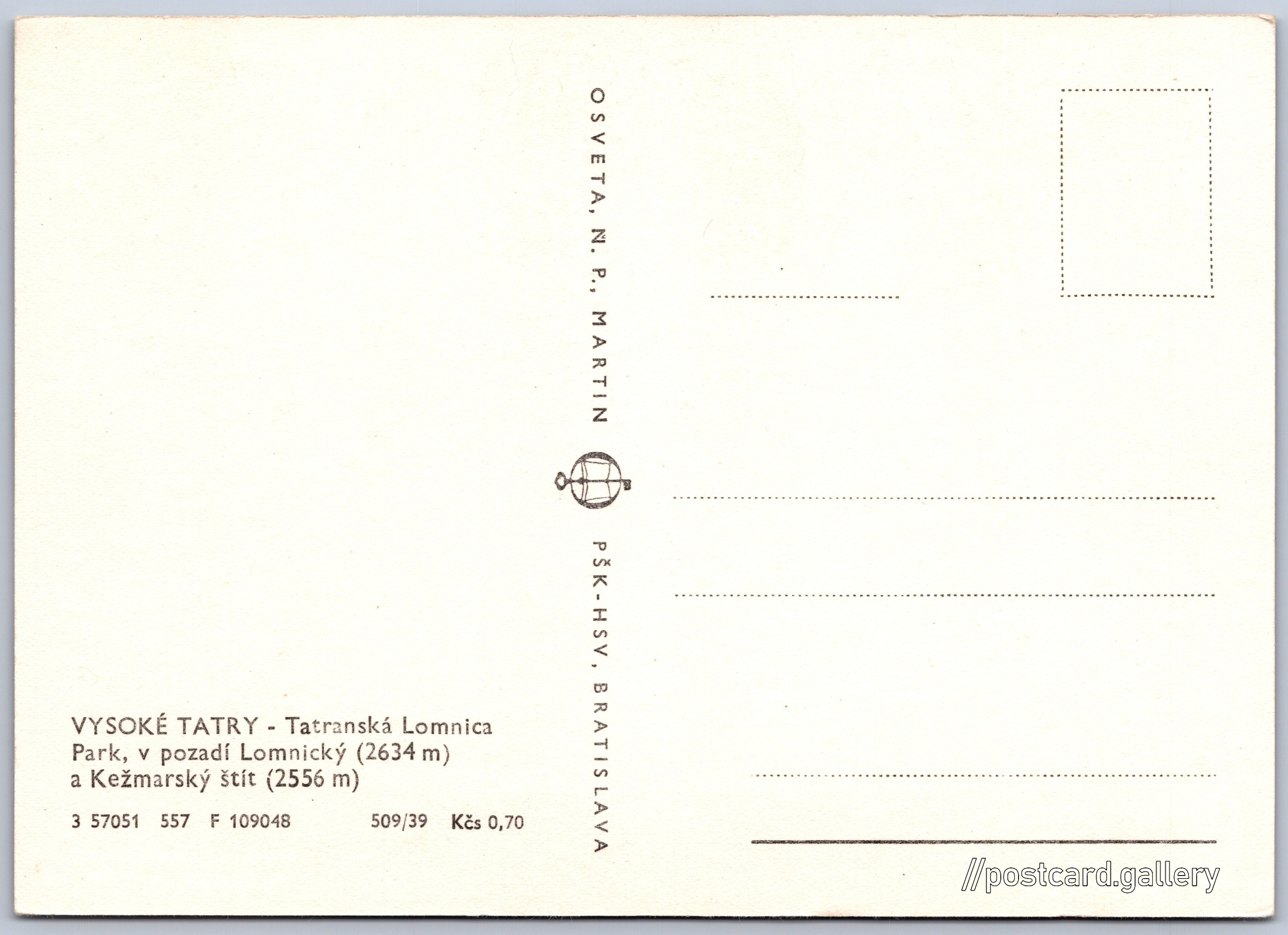 Tatranská Lomnica, park Pokud chcete vidět pohlednice ve vyšším rozlišení nebo zobrazovat jejich zadní stranu, tak se prosím nejdříve přihlašte Přihlásit Zaregistrovat VYSOKÉ TATRY - Tatranská LomnicaPark, v pozadí Lomnický (2634 m) a Kežmarský štít (2556 m) Jazyk tištěného textu na pohlednici: slovenština Cesta svobody ukázat na mapě V blízkém okolí místa zobrazeného na pohlednici lze najít 144 jiných pohlednic. Zobrazit blízké pohlednice Vydavatel: Osveta, n. p., Martin PŠK - Bratislava (Československo) Rok vydání pohlednice: květen, 1957 Velikost (š x v) a tvar pohlednice: 147 x 104 mm (5.79" x 4.09"), obdélník Čistá pohlednice (neprošlá poštou) Ceny: Cena pohlednice: 0,70 Kčs (CSK) Kódy na pohlednici: 3 57051 557 F 109048 509/39 DiskuseVložit příspěvek Přidat novou složku ... Spravovat složky ...