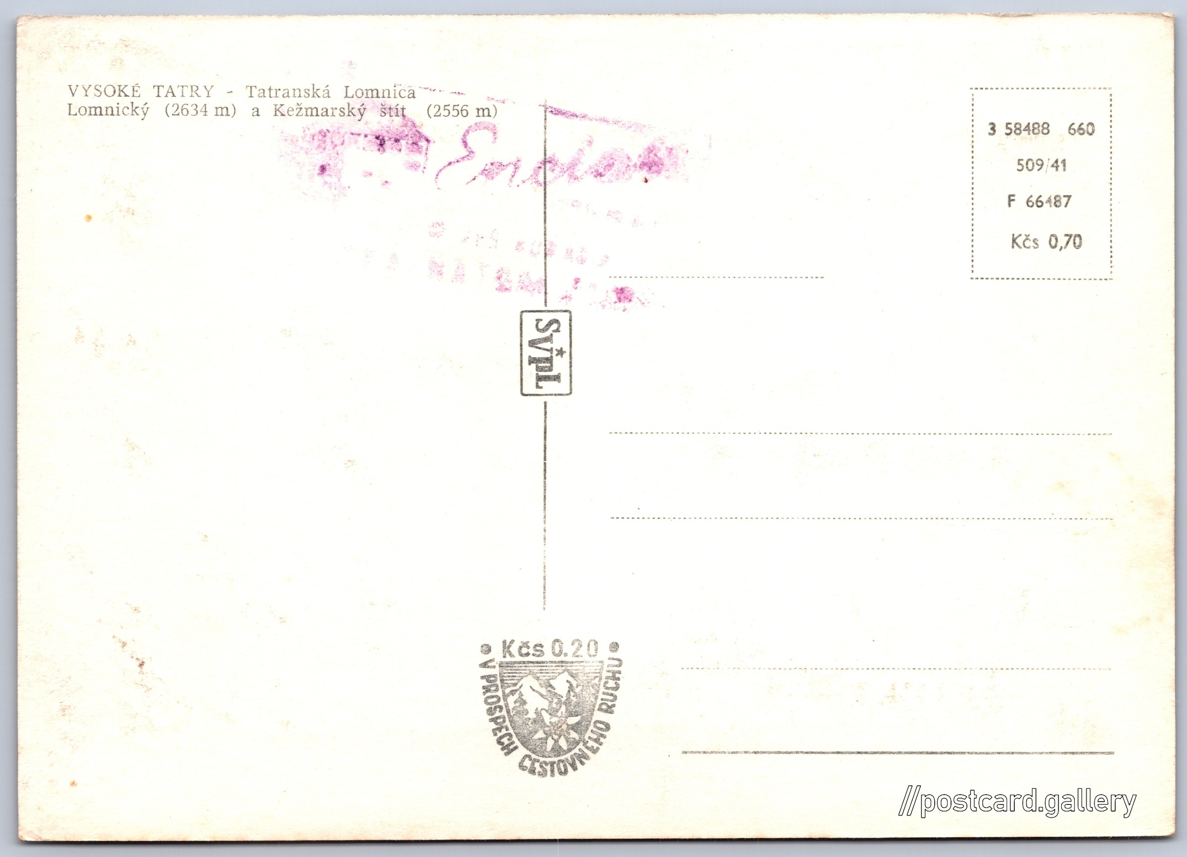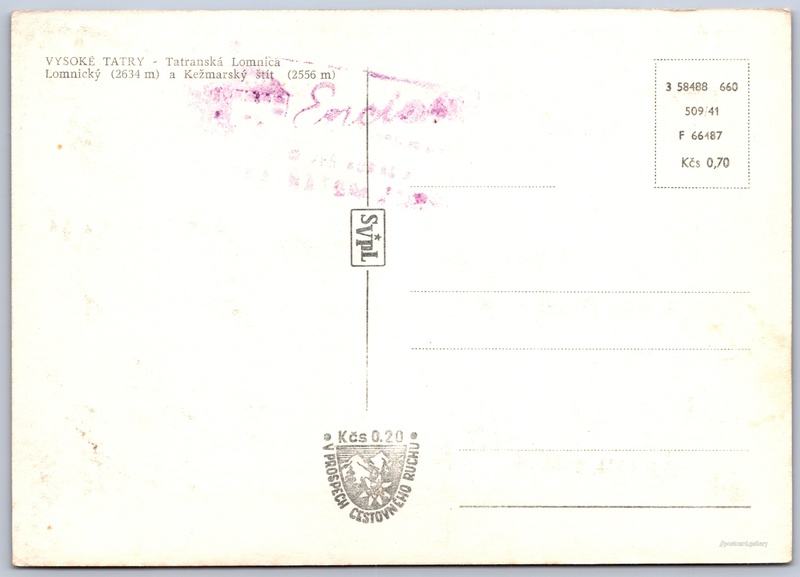 Tatranská Lomnica, park Pokud chcete vidět pohlednice ve vyšším rozlišení nebo zobrazovat jejich zadní stranu, tak se prosím nejdříve přihlašte Přihlásit Zaregistrovat VYSOKÉ TATRY - Tatranská LomnicaLomnický (2634 m) a Kežmarský štít (2556 m) Jazyk tištěného textu na pohlednici: slovenština Tatranská Lomnica ukázat na mapě Přesné místo není známo. Pokud jej znáte, tak jej prosím napište do komentářů nebo označte na mapě Vydavatel: VPL (Československo) Rok vydání pohlednice: červen, 1960 Velikost (š x v) a tvar pohlednice: 145 x 103 mm (5.71" x 4.06"), obdélník Čistá pohlednice (neprošlá poštou) Ceny: Cena pohlednice: 0,70 Kčs (CSK) (+0,20 Kčs přípl. na tur. ruch) Kódy na pohlednici: 3 58488 660 509/41 F 66487 DiskuseVložit příspěvek Přidat novou složku ... Spravovat složky ...
