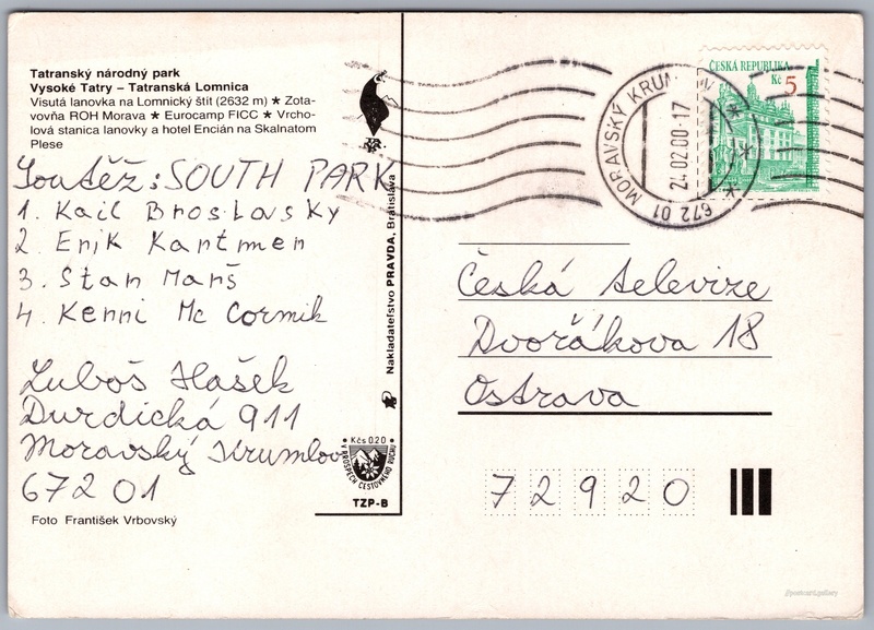 Tatranská Lomnica, zima Pokud chcete vidět pohlednice ve vyšším rozlišení nebo zobrazovat jejich zadní stranu, tak se prosím nejdříve přihlašte Přihlásit Zaregistrovat Tatranská Lomnica Tatranský národný parkVysoké Tatry - Tatranská Lomnica- Visutá lanovka na Lomnický štít (2632 m)- Zotavovňa ROH Morava- Eurocamp FICC- Vrcholová stanica lanovky a hotel Encián na Skalnatom Plese Jazyk tištěného textu na pohlednici: slovenština Zotavovna Morava, Tatranská Lomnica 42, Vysoké Tatry - Tatranská Lomnica, Slovensko ukázat na mapě V blízkém okolí místa zobrazeného na pohlednici lze najít 80 jiných pohlednic. Zobrazit blízké pohlednice Vydavatel: Nakladateľstvo PRAVDA, Bratislava (Československo) Odhadované datum vydání pohlednice: 1997 - 2000 Pomozte nám zpřesnit rok vzniku pohlednice Velikost (š x v) a tvar pohlednice: 148 x 106 mm (5.83" x 4.17"), obdélník Osoby spjaté s touto pohlednicí: František Vrbovský(Autor fotografie) Prošlá poštou:Datum na razítku: 24.2.2000 Ceny: Příplatek na tur. ruch: 0,20 Kčs (CSK))Vyplacené známky: 5,00 Kč (CZK) DiskuseVložit příspěvek Přidat novou složku ... Spravovat složky ...