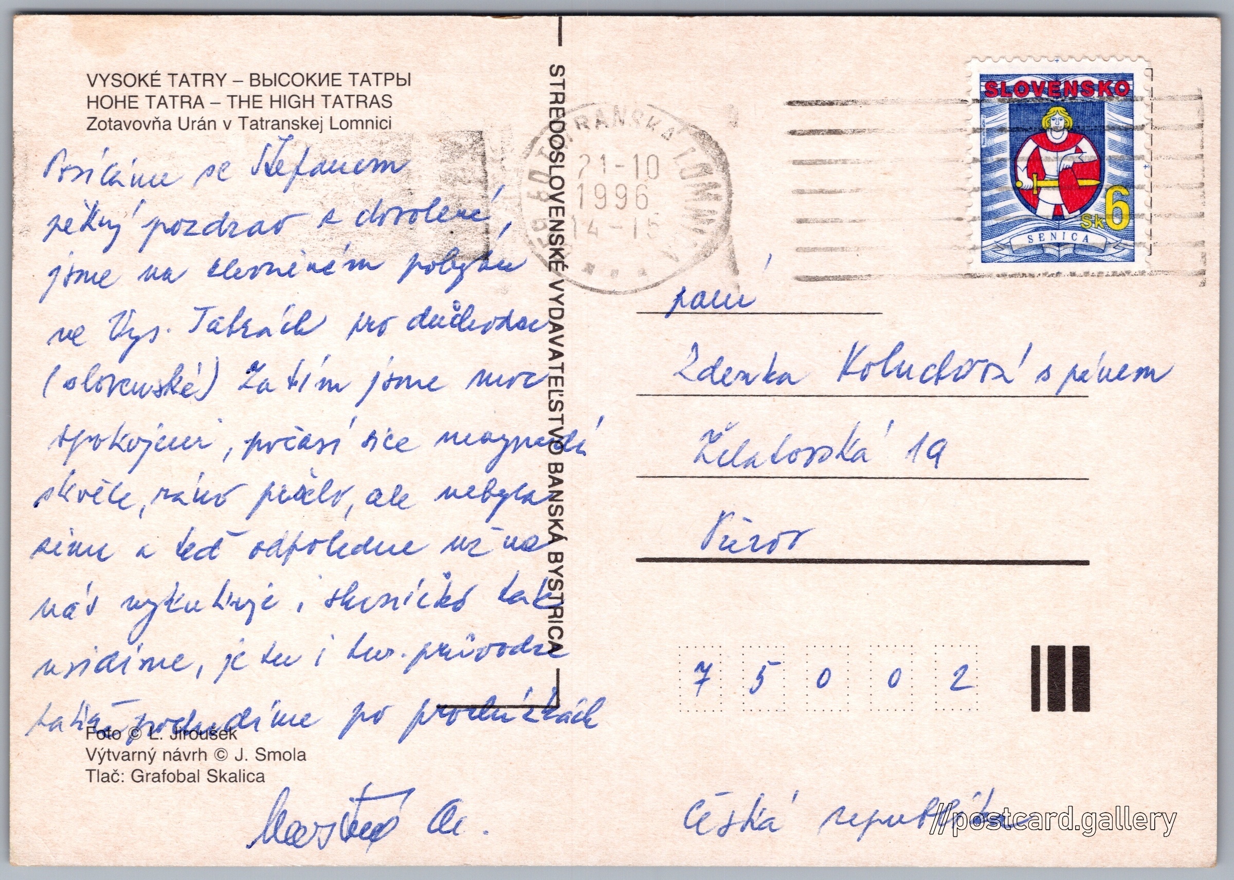 Tatranská Lomnica, zotavovňa Urán 8/81 Pokud chcete vidět pohlednice ve vyšším rozlišení nebo zobrazovat jejich zadní stranu, tak se prosím nejdříve přihlašte Přihlásit Zaregistrovat Tatranská Lomnica VYSOKÉ TATRY - ВЫСОКИЕ ТАТРЫHOHE TATRA - THE HIGH TATRASZotavovňa Urán v Tatranskej Lomnici Jazyk tištěného textu na pohlednici: čeština Hotel SOREA URÁN, Tatranská Lomnica 31, Vysoké Tatry - Tatranská Lomnica, Slovensko ukázat na mapě V blízkém okolí místa zobrazeného na pohlednici lze najít 75 jiných pohlednic. Zobrazit blízké pohlednice Vydavatel: Stredoslovenské vydavateľstvo Banská Bystrica (Slovensko) Odhadované datum vydání pohlednice: 1993 - 1996 Pomozte nám zpřesnit rok vzniku pohlednice Velikost (š x v) a tvar pohlednice: 148 x 104 mm (5.83" x 4.09"), obdélník Osoby spjaté s touto pohlednicí: J. Smola(Design pohlednice) Ladislav Jiroušek(Autor fotografie) Prošlá poštou:Datum na razítku: 21.10.1996 Ceny: Vyplacené známky: 6,00 Sk (SKK) DiskuseVložit příspěvek Přidat novou složku ... Spravovat složky ...
