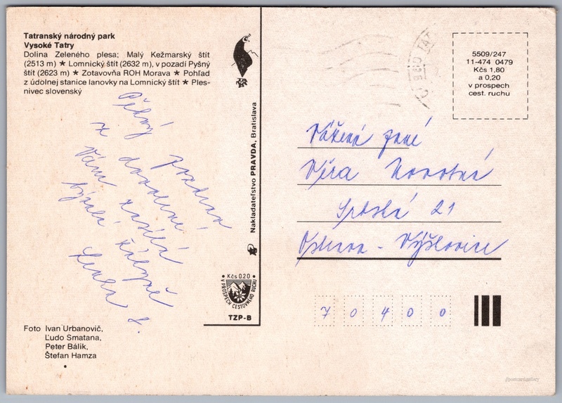 Tatranská Lomnica Pokud chcete vidět pohlednice ve vyšším rozlišení nebo zobrazovat jejich zadní stranu, tak se prosím nejdříve přihlašte Přihlásit Zaregistrovat Tatranská Lomnica Tatranský národný parkVysoké Tatry- Dolina Zeleného plesa; Malý Kežmarský štít (2513 m)- Lomnický štít (2632 m), v pozadí Pyšný štít (2623 m)- Zotavovňa ROH Morava- Pohľad z údolnej stanice lanovky na Lomnický štít- Plesnivec slovenský Jazyk tištěného textu na pohlednici: slovenština Dolina Zeleného plesa, Kaňon, rokle, soutěska, údolí, Tatranská Lomnica 445, Vysoké Tatry - Tatranská Lomnica, Slovensko ukázat na mapě V blízkém okolí místa zobrazeného na pohlednici lze najít 139 jiných pohlednic. Zobrazit blízké pohlednice Vydavatel: Nakladateľstvo PRAVDA, Bratislava (Československo) Rok vydání pohlednice: duben, 1979 Velikost (š x v) a tvar pohlednice: 147 x 103 mm (5.79" x 4.06"), obdélník Osoby spjaté s touto pohlednicí: Peter Bálik(Autor fotografie) Ľudo Smatana(Autor fotografie) Ivan Urbanovič(Autor fotografie) Štefan Hamza(Autor fotografie) Prošlá poštou Ceny: Cena pohlednice: 1,80 Kčs (CSK) (+0,20 Kčs přípl. na tur. ruch) Kódy na pohlednici: 11-474 0479 5509/247 DiskuseVložit příspěvek Přidat novou složku ... Spravovat složky ...