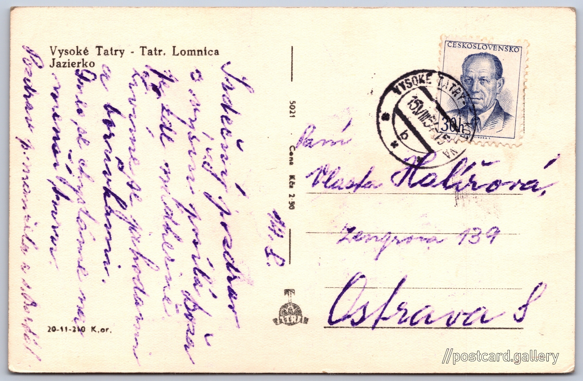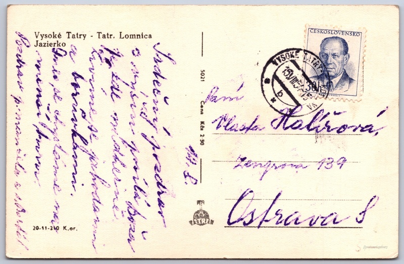 Tatraská Lomnice, jezírko Pokud chcete vidět pohlednice ve vyšším rozlišení nebo zobrazovat jejich zadní stranu, tak se prosím nejdříve přihlašte Přihlásit Zaregistrovat Vysoké Tatry - Tatr. LomnicaJazierko Jazyk tištěného textu na pohlednici: slovenština Tatranská Lomnica ukázat na mapě V blízkém okolí místa zobrazeného na pohlednici lze najít 76 jiných pohlednic. Zobrazit blízké pohlednice Vydavatel: Tatran (Československo) Odhadované datum vydání pohlednice: 1951 - 1954 Pomozte nám zpřesnit rok vzniku pohlednice Velikost (š x v) a tvar pohlednice: 139 x 90 mm (5.47" x 3.54"), obdélník Prošlá poštou:Datum na razítku: 15.8.1954Datum napsání pohledu: 14.8.1951 Ceny: Cena pohlednice: 2,50 Kčs (CSK)Vyplacené známky: 0,30 Kčs (CSK) Kódy na pohlednici: 5021 20-11-210 K.or. DiskuseVložit příspěvek Přidat novou složku ... Spravovat složky ...
