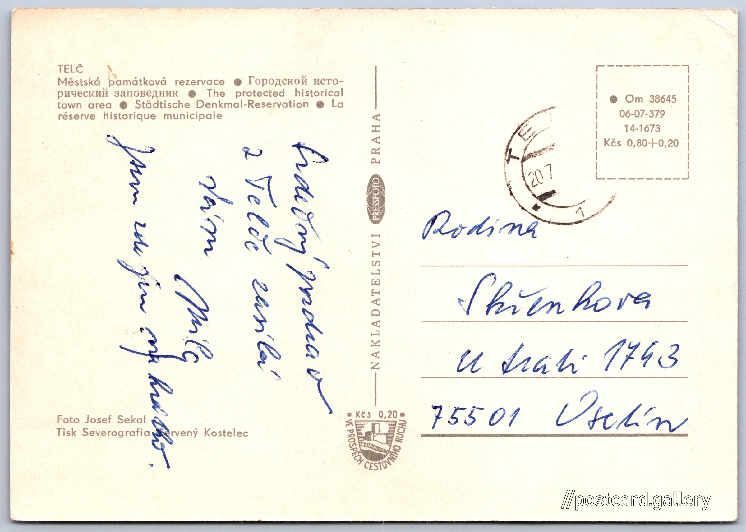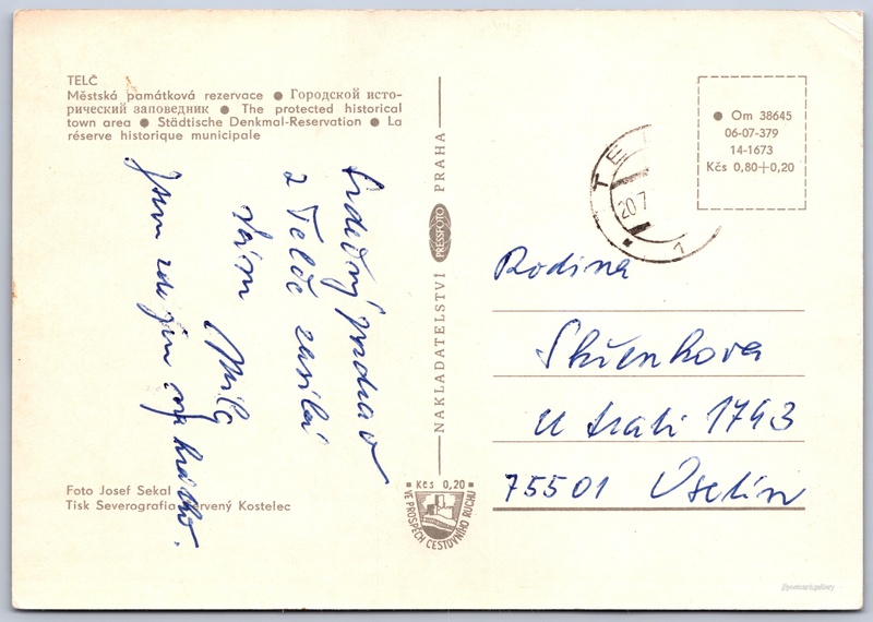 Telč, náměstí 10/13 Pokud chcete vidět pohlednice ve vyšším rozlišení nebo zobrazovat jejich zadní stranu, tak se prosím nejdříve přihlašte Přihlásit Zaregistrovat TELČ- Městská památková rezervace- Городской исторический заповедник- The protected historical town area- Städtische Denkmal-Reservation- La réserve historique municipale Jazyk tištěného textu na pohlednici: čeština náměstí Zachariáše z Hradce, Telč, Jihlava ukázat na mapě V blízkém okolí místa zobrazeného na pohlednici lze najít 13 jiných pohlednic. Zobrazit blízké pohlednice Vydavatel: PressFoto Praha (Československo) Rok vydání pohlednice: 1973 Velikost (š x v) a tvar pohlednice: 148 x 104 mm (5.83" x 4.09"), obdélník Osoby spjaté s touto pohlednicí: Josef Sekal(Autor fotografie) Prošlá poštou Ceny: Cena pohlednice: 0,80 Kčs (CSK) (+0,20 Kčs přípl. na tur. ruch) Kódy na pohlednici: Om 38645 06-07-379 14-1673 DiskuseVložit příspěvek Přidat novou složku ... Spravovat složky ...