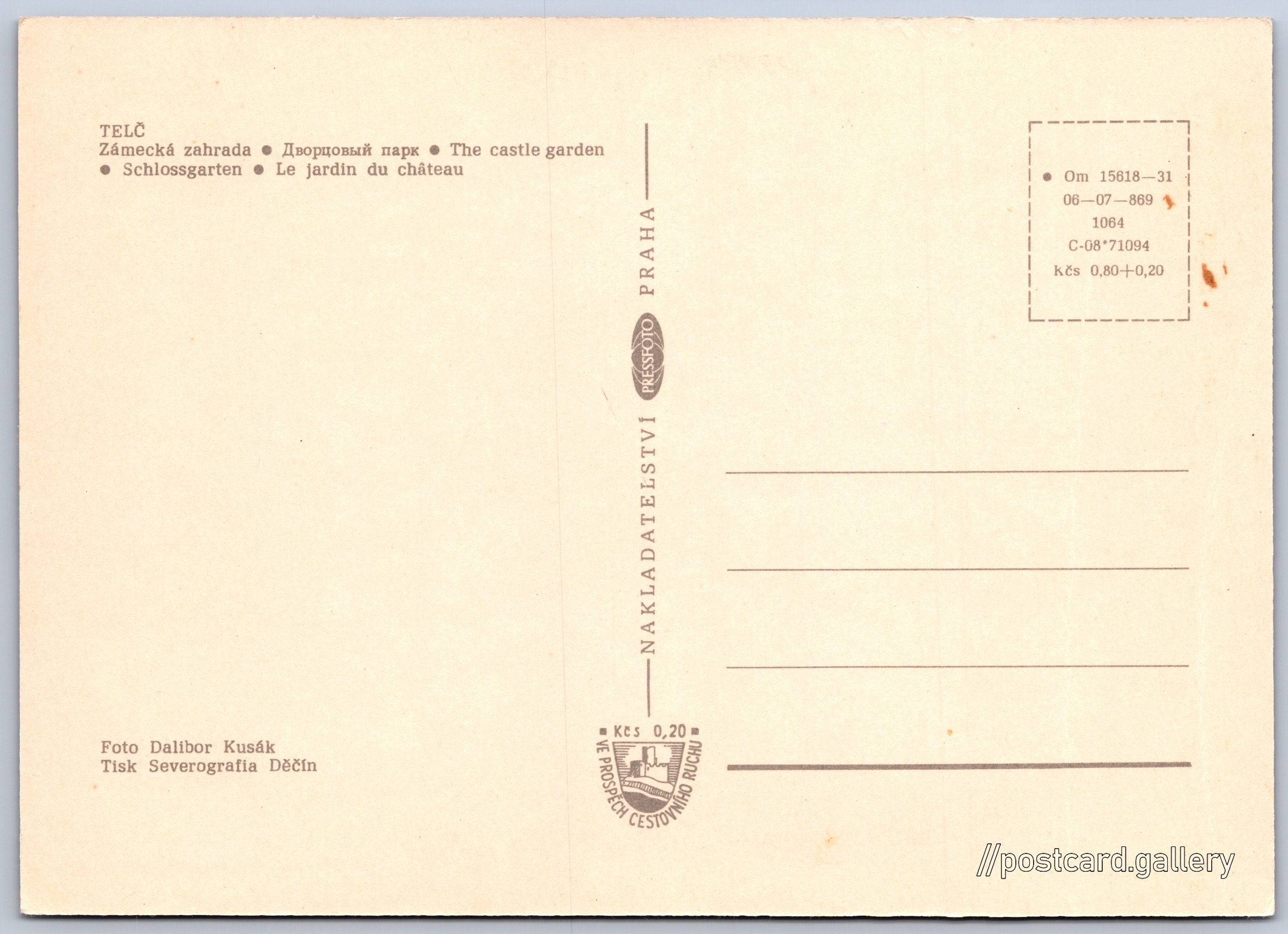 Telč, zámecká zahrada 3/13 Pokud chcete vidět pohlednice ve vyšším rozlišení nebo zobrazovat jejich zadní stranu, tak se prosím nejdříve přihlašte Přihlásit Zaregistrovat TELČ- Zámecká zahrada- Дворцовый парк- The castle garden- Schlossgarten- Le jardin du château Jazyky tištěného textu na pohlednici: čeština, ruština, angličtina, němčina, francouzština, francouzština Telč-Vnitřní Město, Telč, Jihlava ukázat na mapě V blízkém okolí místa zobrazeného na pohlednici lze najít 13 jiných pohlednic. Zobrazit blízké pohlednice Vydavatel: PressFoto Praha (Československo) Rok vydání pohlednice: 1968 Velikost (š x v) a tvar pohlednice: 147 x 105 mm (5.79" x 4.13"), obdélník Osoby spjaté s touto pohlednicí: Dalibor Kusák(Autor fotografie) Čistá pohlednice (neprošlá poštou) Ceny: Cena pohlednice: 0,80 Kčs (CSK) (+0,20 Kčs přípl. na tur. ruch) Kódy na pohlednici: •Om 15618-31 06-07-869 1064 C-08*71094 DiskuseVložit příspěvek Přidat novou složku ... Spravovat složky ...