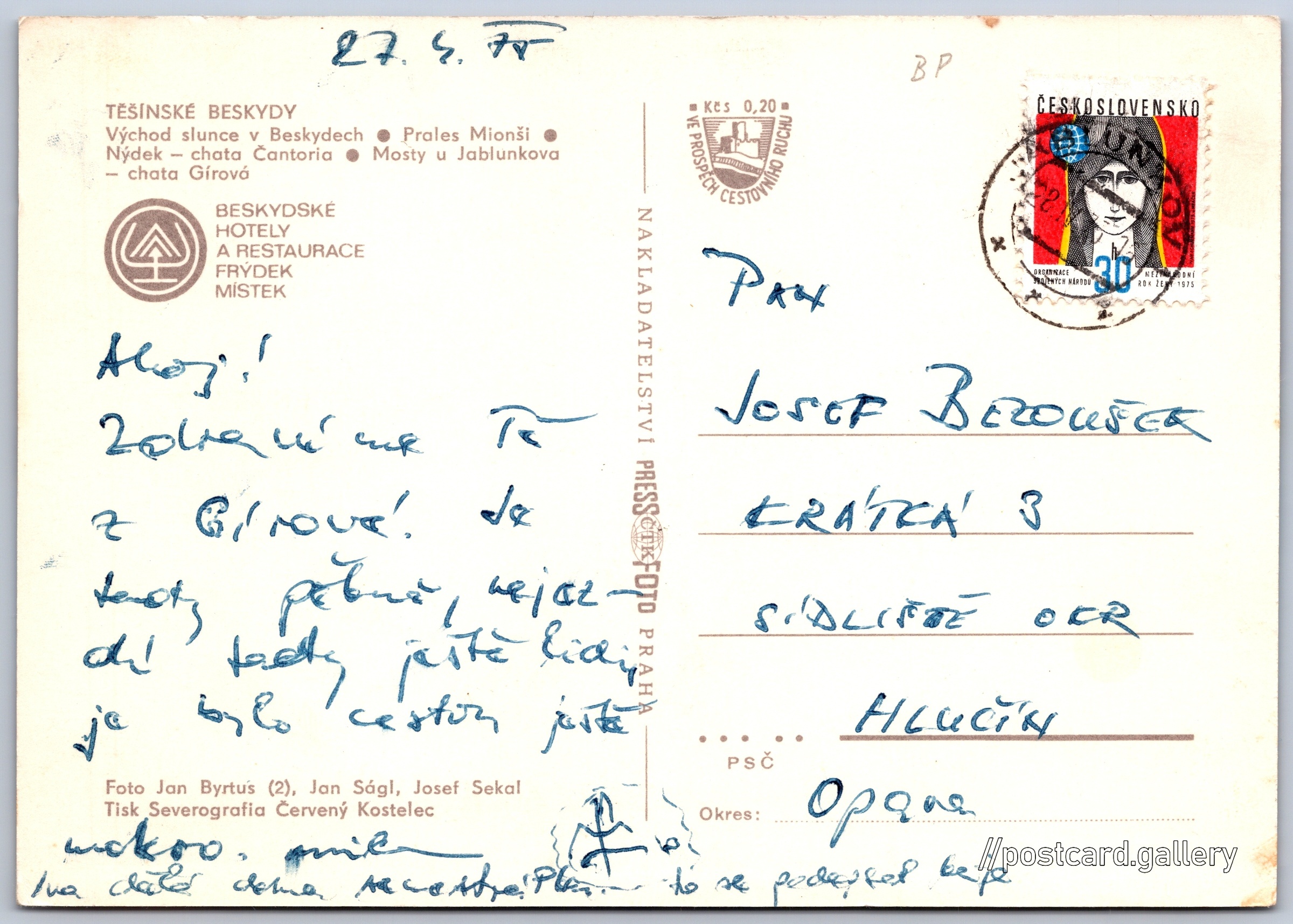 Těšínské Beskydy Pokud chcete vidět pohlednice ve vyšším rozlišení nebo zobrazovat jejich zadní stranu, tak se prosím nejdříve přihlašte Přihlásit Zaregistrovat Těšínské Beskydy TĚŠÍNSKÉ BESKYDY- Východ slunce v Beskydech- Prales Mionši- Nýdek - chata Čantoria- Mosty u Jablunkova - chata GírováBESKYDSKÉ HOTELY A RESTAURACE FRÝDEK MÍSTEK Jazyk tištěného textu na pohlednici: čeština Národní přírodní rezervace Mionší, Chráněné území, okres Frýdek-Místek, Moravskoslezský kraj, Česko ukázat na mapě V blízkém okolí místa zobrazeného na pohlednici lze najít 12 jiných pohlednic. Zobrazit blízké pohlednice Vydavatel: PressFoto Praha (Československo) Odhadované datum vydání pohlednice: 1972 - 1975 Pomozte nám zpřesnit rok vzniku pohlednice Velikost (š x v) a tvar pohlednice: 149 x 105 mm (5.87" x 4.13"), obdélník Osoby spjaté s touto pohlednicí: Jan Ságl(Autor fotografie) Josef Sekal(Autor fotografie) Jan Byrtus(Autor fotografie) Prošlá poštou:Datum na razítku: 27.4.1975Datum napsání pohledu: 27.4.1975 Ceny: Příplatek na tur. ruch: 0,20 Kčs (CSK))Vyplacené známky: 0,30 Kčs (CSK) DiskuseVložit příspěvek Přidat novou složku ... Spravovat složky ...