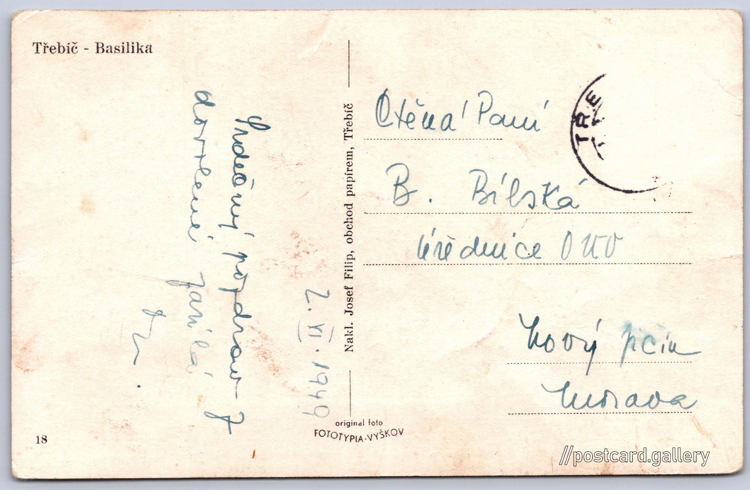 Třebíč, bazilika Pokud chcete vidět pohlednice ve vyšším rozlišení nebo zobrazovat jejich zadní stranu, tak se prosím nejdříve přihlašte Přihlásit Zaregistrovat Třebíč - Basilika Jazyk tištěného textu na pohlednici: čeština Bazilika sv. Prokopa, Kostel, Třebíč - Podklášteří, Česko ukázat na mapě V blízkém okolí místa zobrazeného na pohlednici lze najít 4 jiné pohlednice. Zobrazit blízké pohlednice Vydavatel: Fototypia - Vyškov (Československo)Josef Filip, obchod papírem (Československo) Odhadované datum vydání pohlednice: 1946 - 1949 Pomozte nám zpřesnit rok vzniku pohlednice Velikost (š x v) a tvar pohlednice: 139 x 90 mm (5.47" x 3.54"), obdélník Prošlá poštou:Datum na razítku: 2.6.1949Datum napsání pohledu: 2.6.1949 Kódy na pohlednici: 18 DiskuseVložit příspěvek Přidat novou složku ... Spravovat složky ...