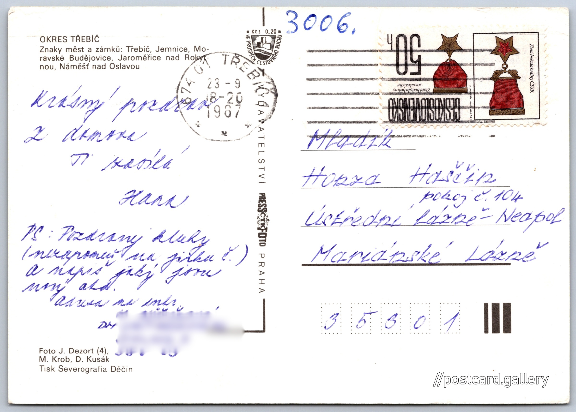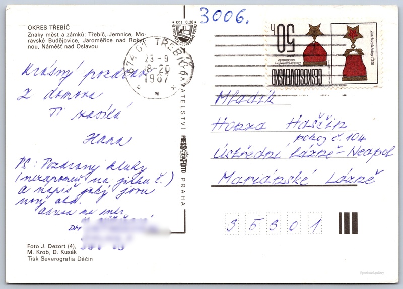 Třebíčsko Pokud chcete vidět pohlednice ve vyšším rozlišení nebo zobrazovat jejich zadní stranu, tak se prosím nejdříve přihlašte Přihlásit Zaregistrovat TŘEBÍČSKO, MORAVSKÉ BUDĚJOVICE, JEMNICE, TŘEBÍČ, NÁMĚŠŤ NAD OSLAVOU, JAROMĚŘICE NAD ROKYTNOU, KRAMOLÍN, MOHELNO, JIHOMORAVSKÝ KRAJ OKRES TŘEBÍČZnaky měst a zámků: Třebíč, Jemnice, Moravské Budějovice, Jaroměřice nad Rokytnou, Náměšť nad Oslavou Jazyk tištěného textu na pohlednici: čeština Zámek Jemnice, Zámek, Husova 1, Jemnice, Česko ukázat na mapě Vydavatel: PressFoto Praha (Československo) Odhadované datum vydání pohlednice: 1984 - 1987 Pomozte nám zpřesnit rok vzniku pohlednice Velikost (š x v) a tvar pohlednice: 148 x 105 mm (5.83" x 4.13"), obdélník Osoby spjaté s touto pohlednicí: Miroslav Krob(Autor fotografie) Dalibor Kusák(Autor fotografie) Jovan Dezort(Autor fotografie) Prošlá poštou:Datum na razítku: 23.9.1987 Ceny: Příplatek na tur. ruch: 0,20 Kčs (CSK))Vyplacené známky: 0,50 Kčs (CSK) DiskuseVložit příspěvek Přidat novou složku ... Spravovat složky ...